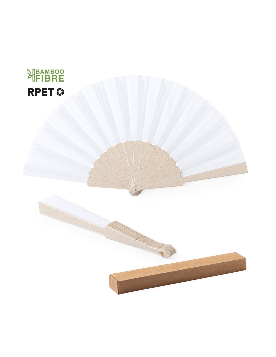Abanico de línea nature, con varillas de fibra de bambú y tela en RPET, elaborado a partir de plástico reciclado, para así fomentar la reutilización de residuos plásticos y ayudar a la sostenibilidad del planeta. Presentado en caja individual de diseño eco.