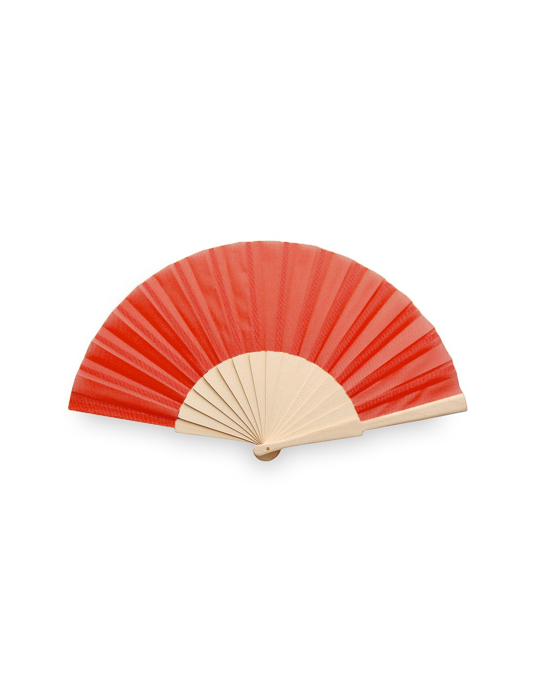 Abanico de varillas de madera natural y tela en poliéster de variados colores. Presentado en caja individual.