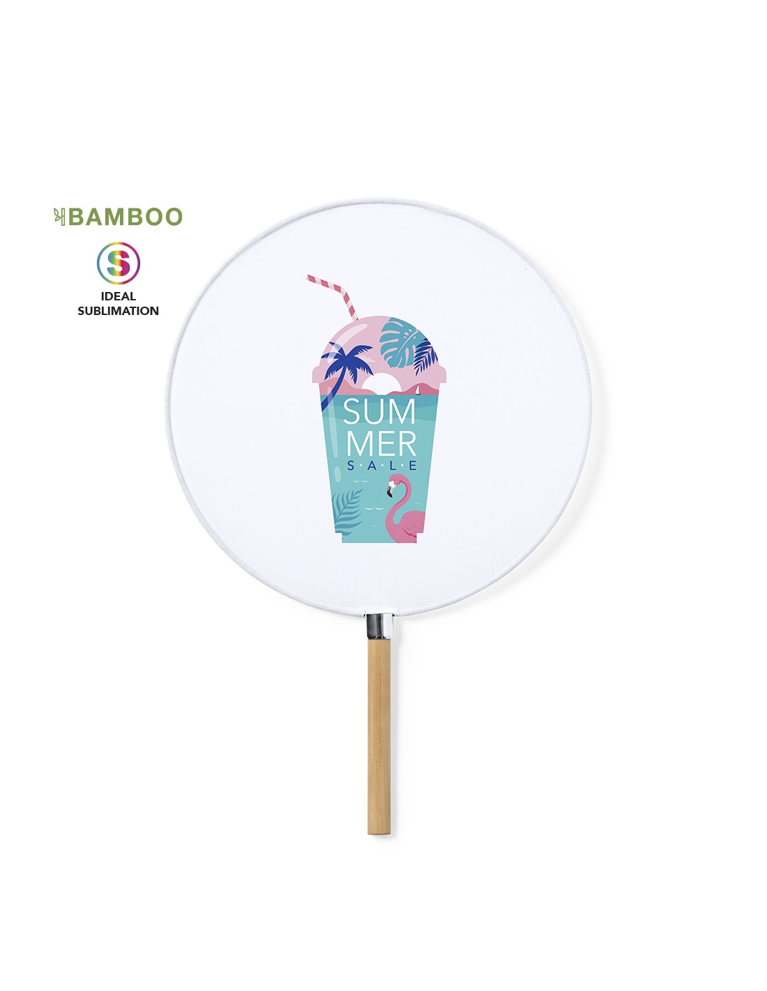 Elegante Pai Pai fabricado en resistente poliéster especial para sublimación. Con mango en bambú y detalle en cromado.