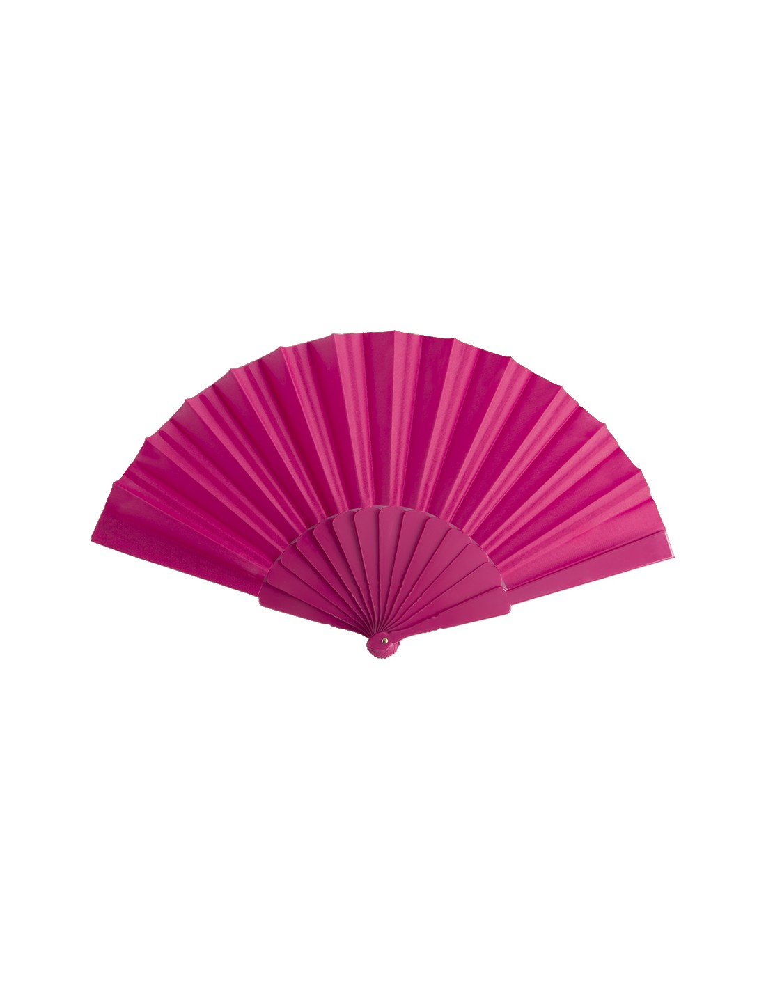 Abanico de varillas de plástico y tela en poliéster de variados colores. Presentado en caja individual con ventana.