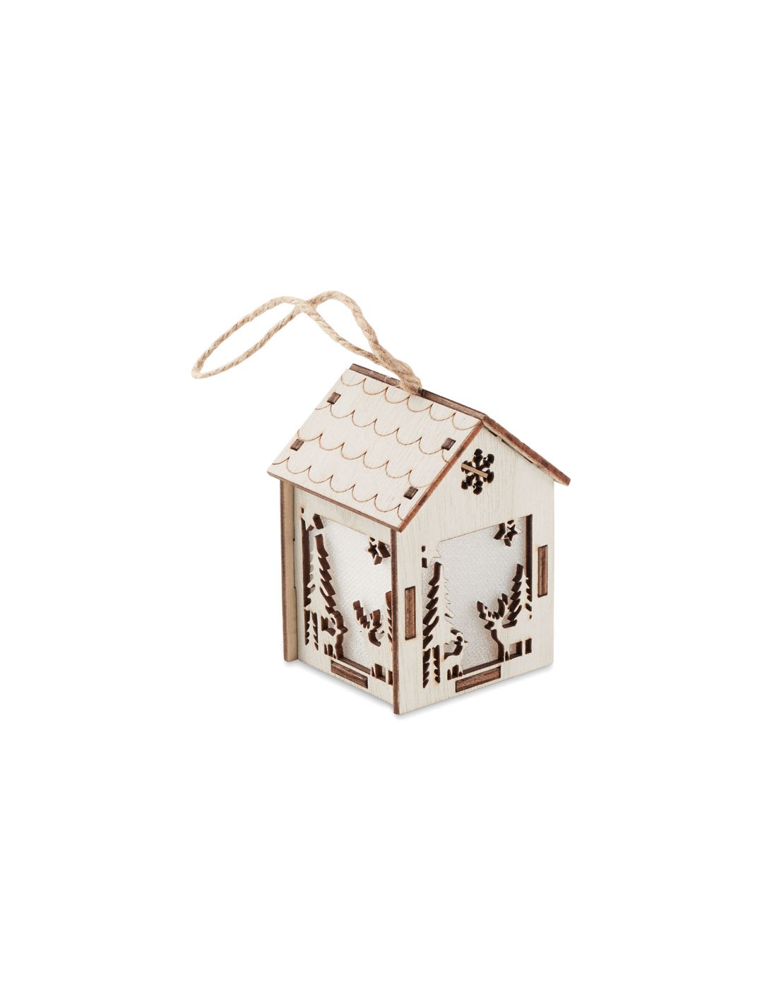 Adorno para colgar en forma de casa de MDF con luz interior y motivos navideños. Incluye 3 baterías AG10.