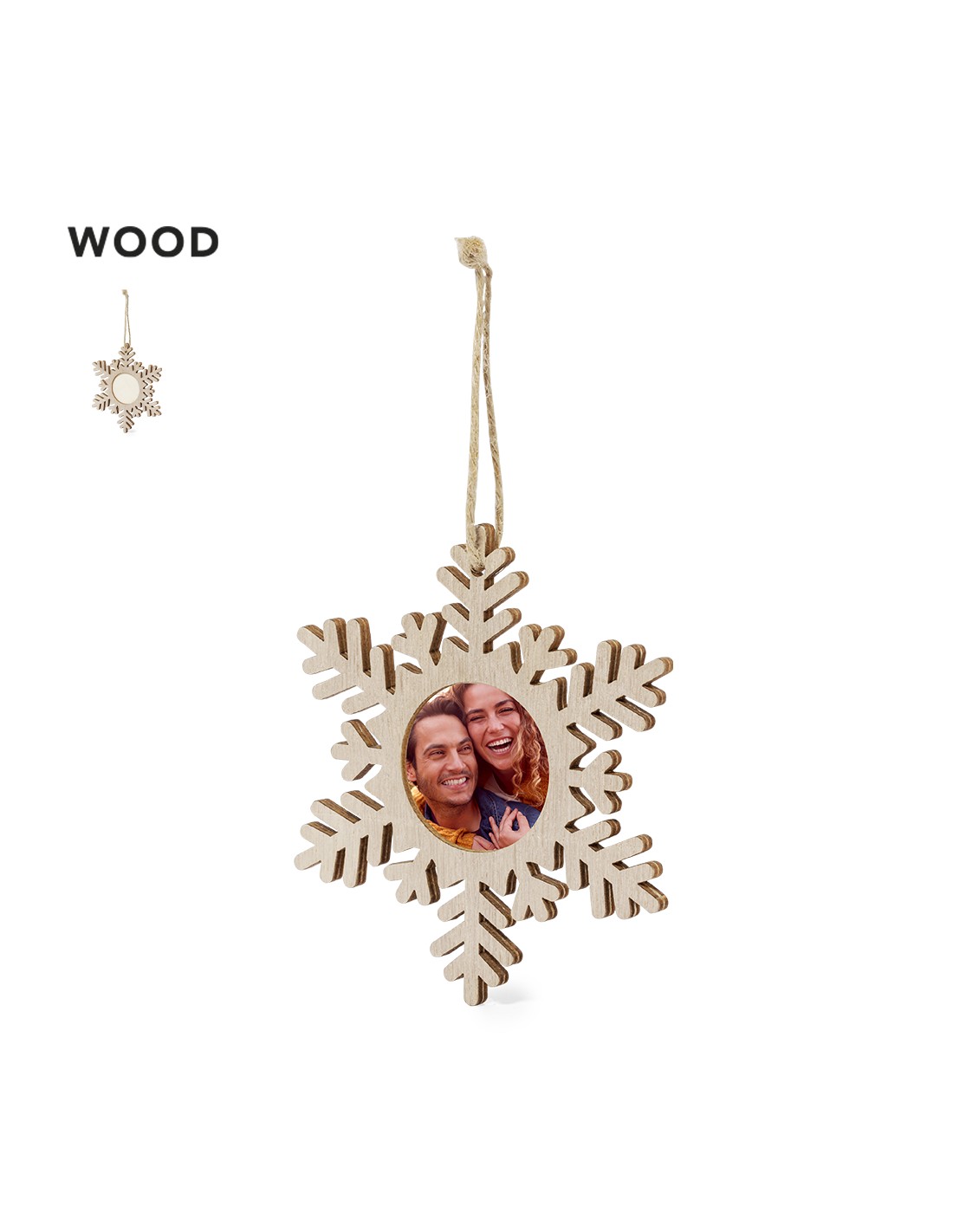 Adornos de navidad disponibles en 3 formatos: copo de nieve, árbol de Navidad y estrella con cordón para colgar y fventana para otografías en tamaño 4 x 4 cm.