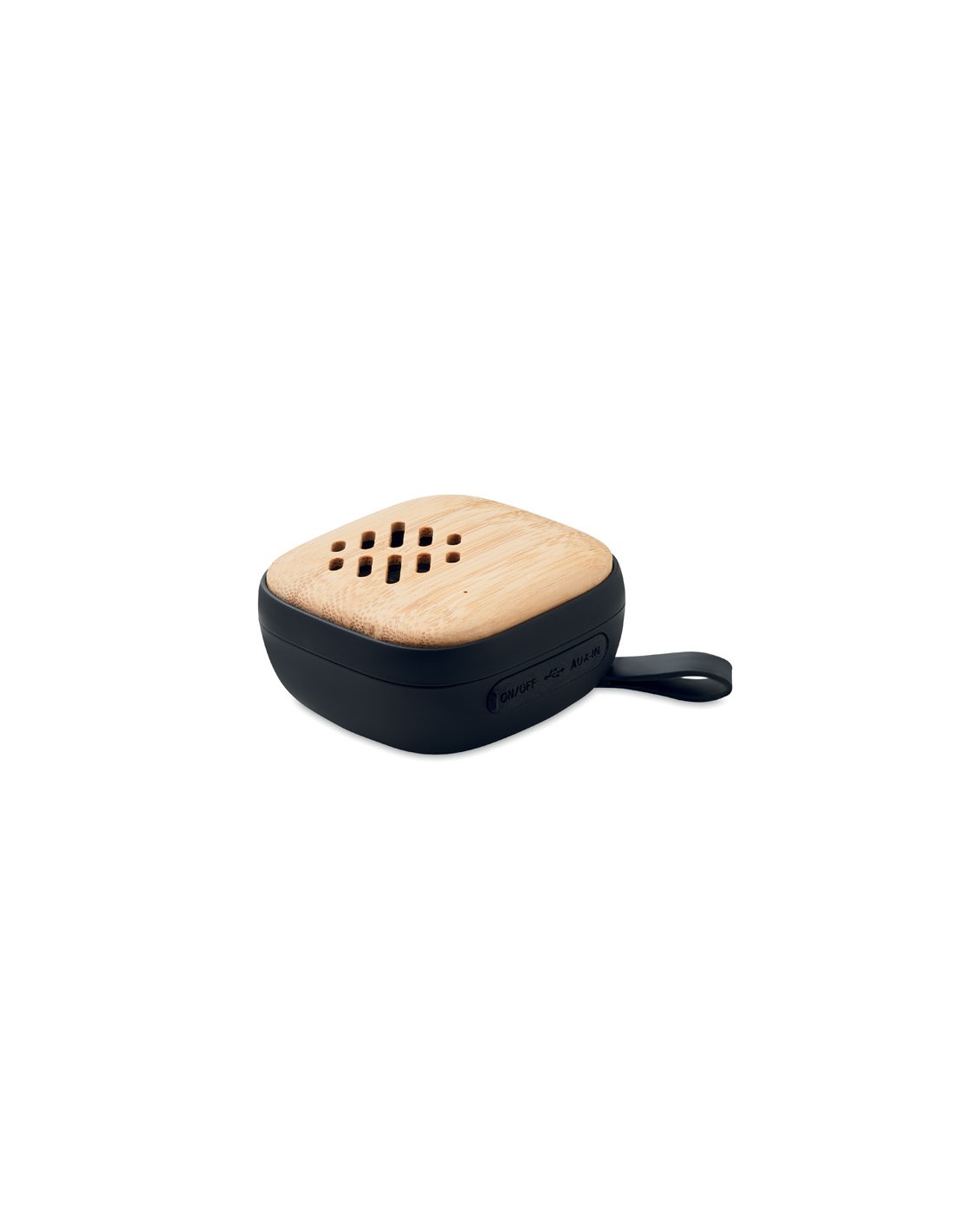 Altavoz inalámbrico 5.0 de bambú y cuerpo de ABS con asa de silicona. 1 batería recargable Li-Ion de 400 mAh. Datos de salida: 3W, 4 Ohm. Tiempo de reproducción aprox. 2h. El bambú es material natural, el color del articulo puede variar.