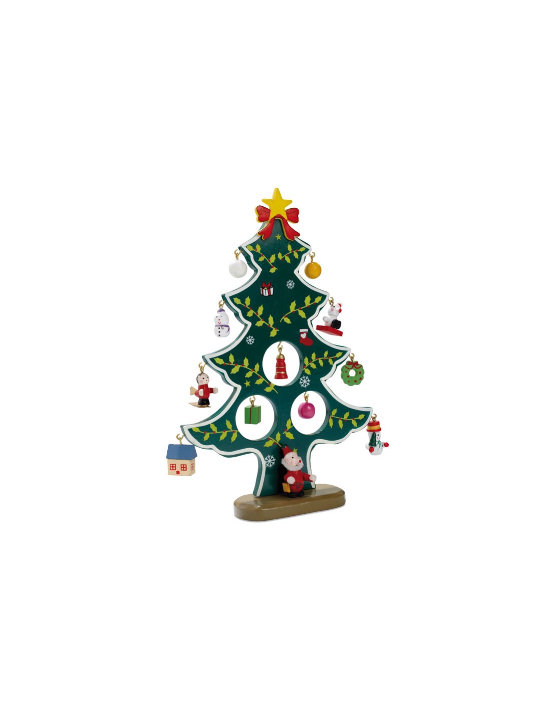 Árbol de navidad de madera con 12 adornos para colgar. Presentado en una caja individual con tapa transparente.