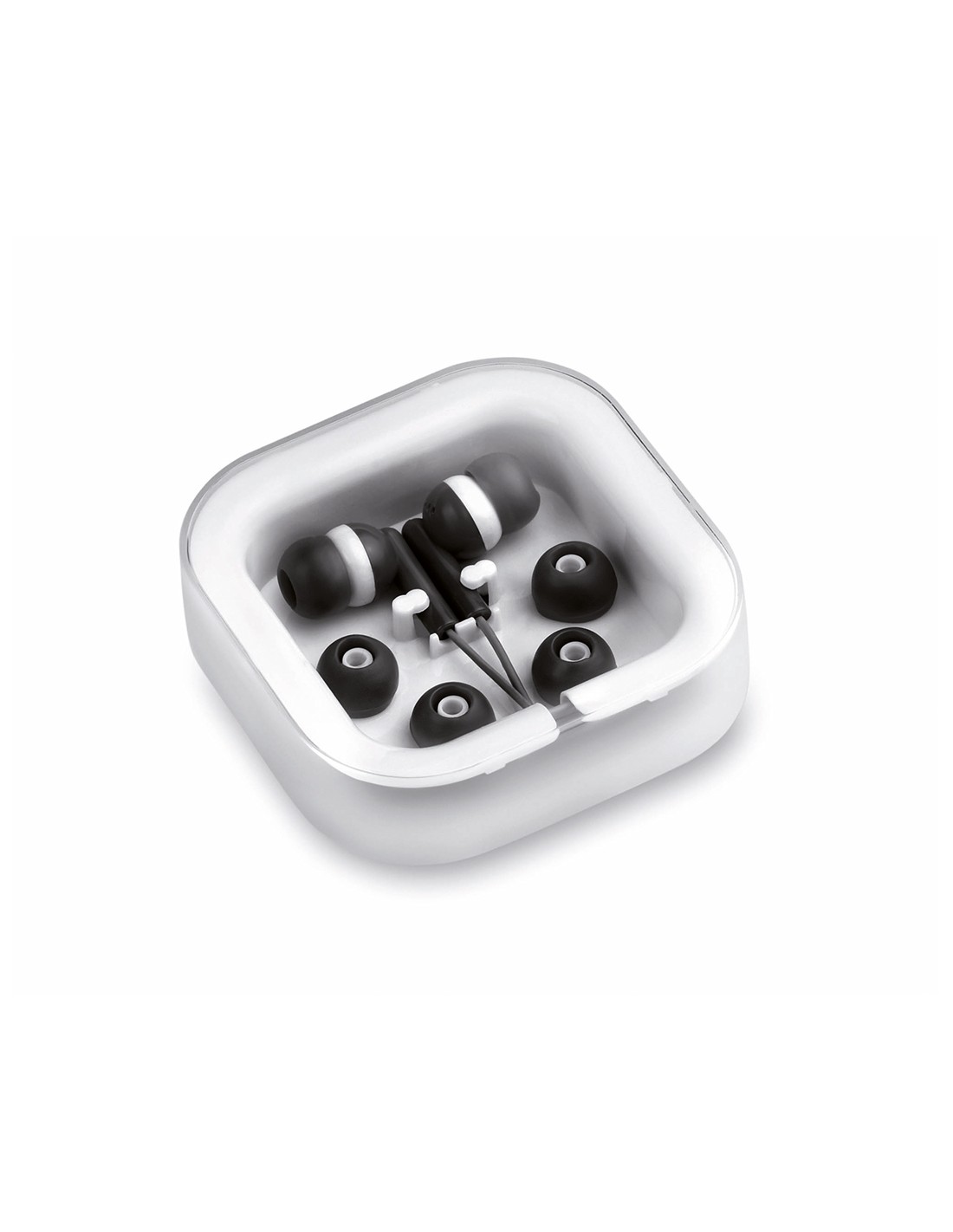 Estos auriculares personalizados intraurales de diseño desenfadado y bicolor son muy prácticos y confortables ya que si pequeño tamaño te permitirá transportarlos donde desees ir. Además disponen de conexión jack de 3,5 mm y de un cable en color a juego. Este modelo te lo presentamos en un elegante estuche de diseño y con almohadillas de recambio, lo que hace que sea un regalo todavía mucho más exclusivo. La parte superior del estuche es totalmente personalizable para que puedas añadir el logo de tu empresa y así dar a conocer tu negocio de una manera muy original. Disponibles en color blanco, negro, rosa, naranja, amarillo, verde, azul o rojo. Material: Plástico ABS Medidas: 7 x 7 x 2 cm Peso: 30 g