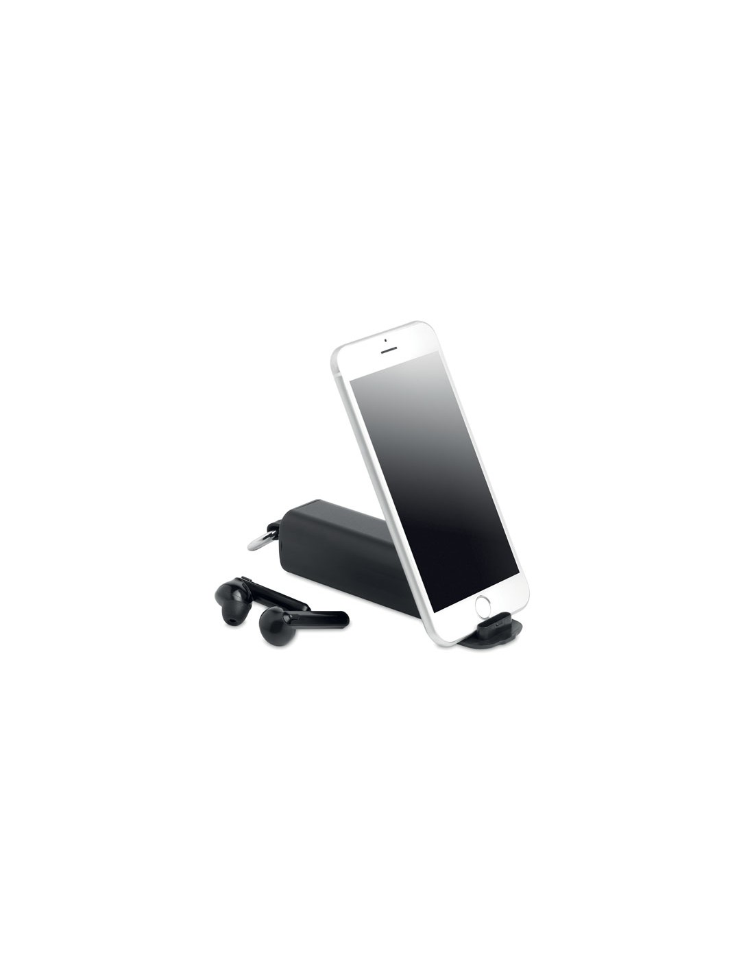Auriculares inalámbricos True Wireless Stereo (TWS) 5.0 con micrófono y batería recargable de 35 mAh integrada. Tiempo de reproducción aproximado de 3 horas. Emparejamiento automático. Incluye un cable de carga micro USB y una estación de carga de 250 mAh. Con llavero y soporte para el teléfono.
