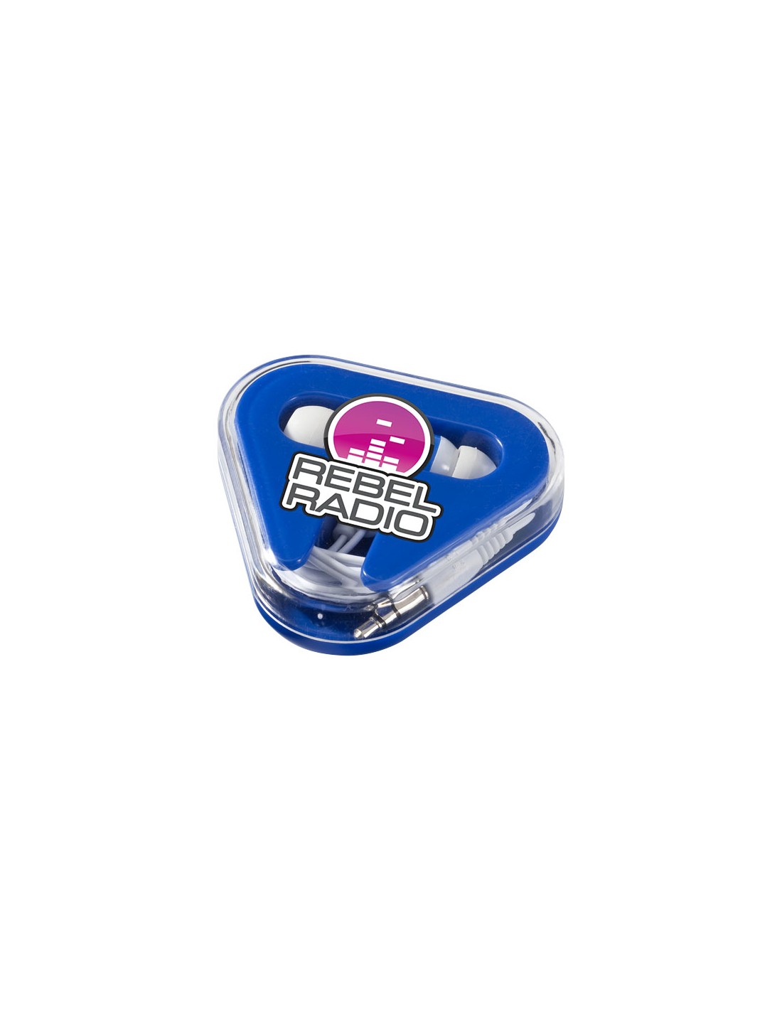 Auriculares personalizados multidispositivos internos. Estos auriculares vienen en un estuche triangular de plástico con espacio para guardar el cable. Gracias a este estuche podrás llevarlos contigo allí donde vayas. Son ideales como regalo de empresa para tus empleados. Su dispositivo incorporado dispone de un audio estándar con conector de audio de 3,5 mm. Disponibles en color negro, blanco, naranja, verde lima, azul o rojo. Material: Plástico ABS Medidas: 6 x 6,5 x 1,7 cm Peso: 28 g
