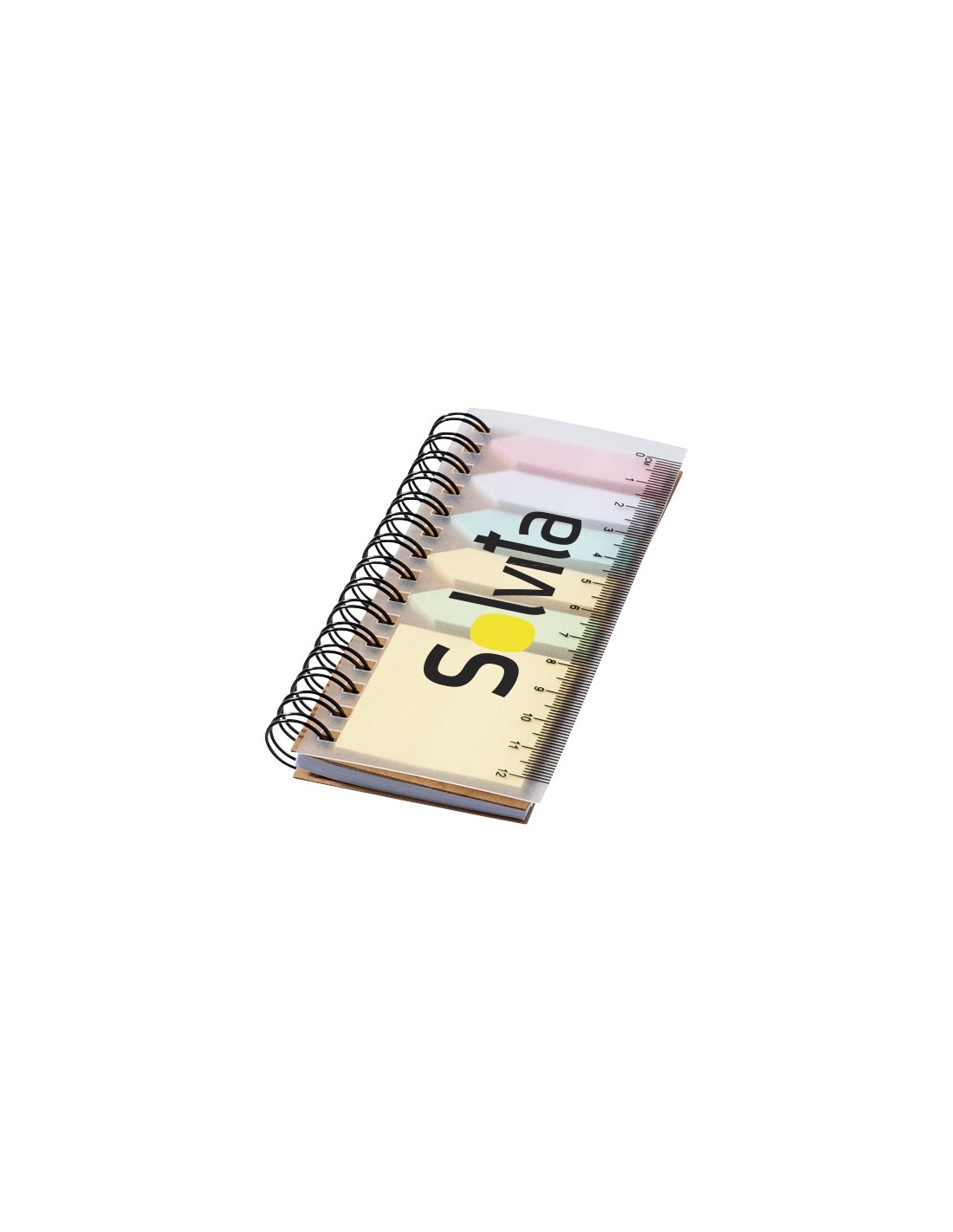 Blocs de notas personalizados con espiral en formato de libreta, con la tapa translúcida y con regla incorporada. Disponen de 6 tacos de 25 notas adhesivas por cada color y de 40 páginas de papel blanco a rayas para tomar anotaciones rápidas. Se trata de un regalo publicitario multiusos genial para todos aquellos usuarios que trabajan en escritorios y oficinas. Estampando tu logo en su portada, conseguirás que tus clientes potenciales incorporen a su rutina un producto de tu empresa, de modo que serán mucho más susceptibles de tenerte como primera opción cuando requieran del producto o servicio que ofreces. Material: Papel y plástico PP Medidas: 13,3 x 5,8 x 1,1 cm Peso: 40 g