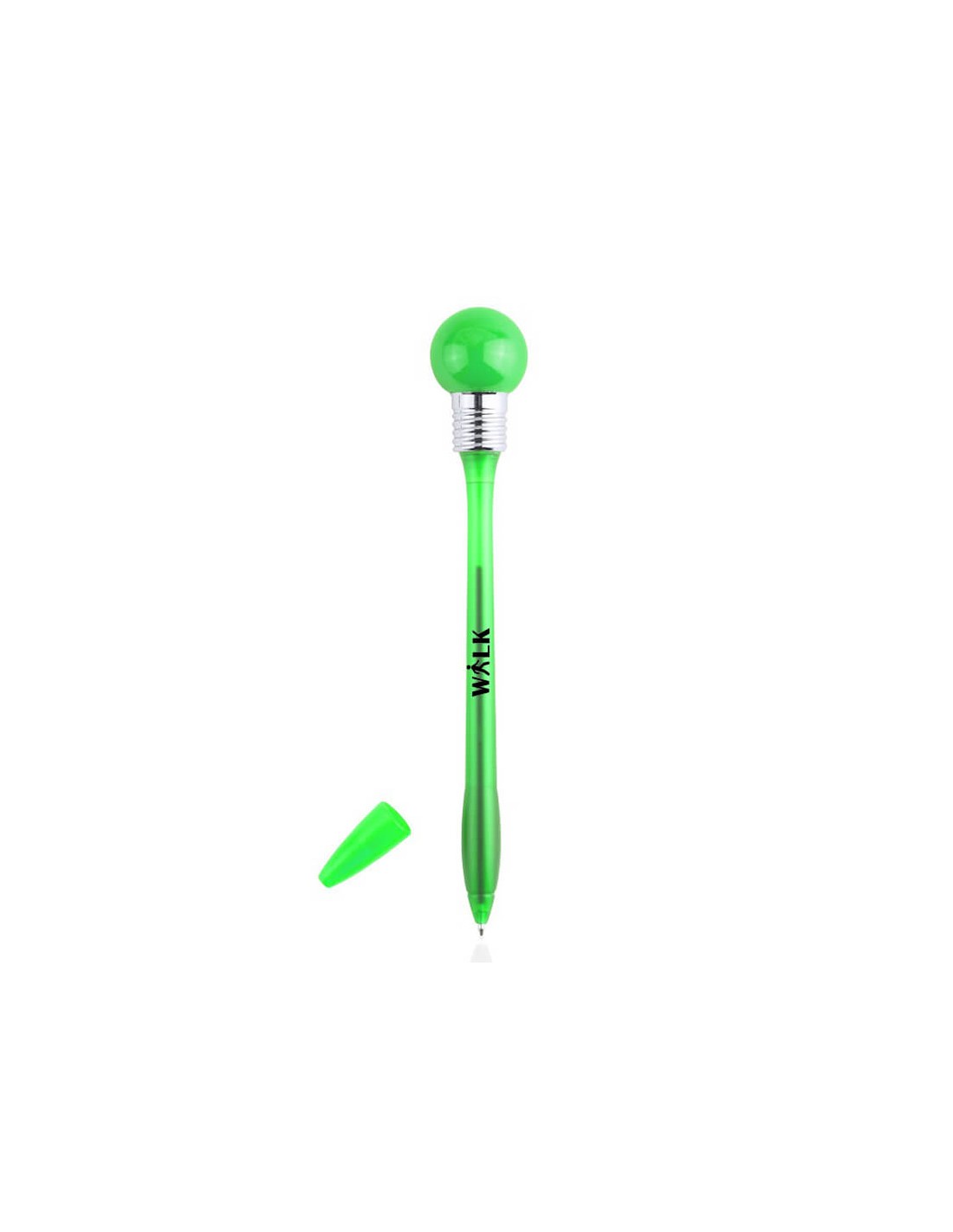 Divertido bolígrafo bombilla con cuerpo de suave acabado en vivos colores transparentes. Con linterna esférica de goma con luz a juego que se activa dejando caer el bolígrafo en una superficie dura. Capucha a juego y en tinta azul. Luces Led Multicolor. Pilas Botón Incluidas