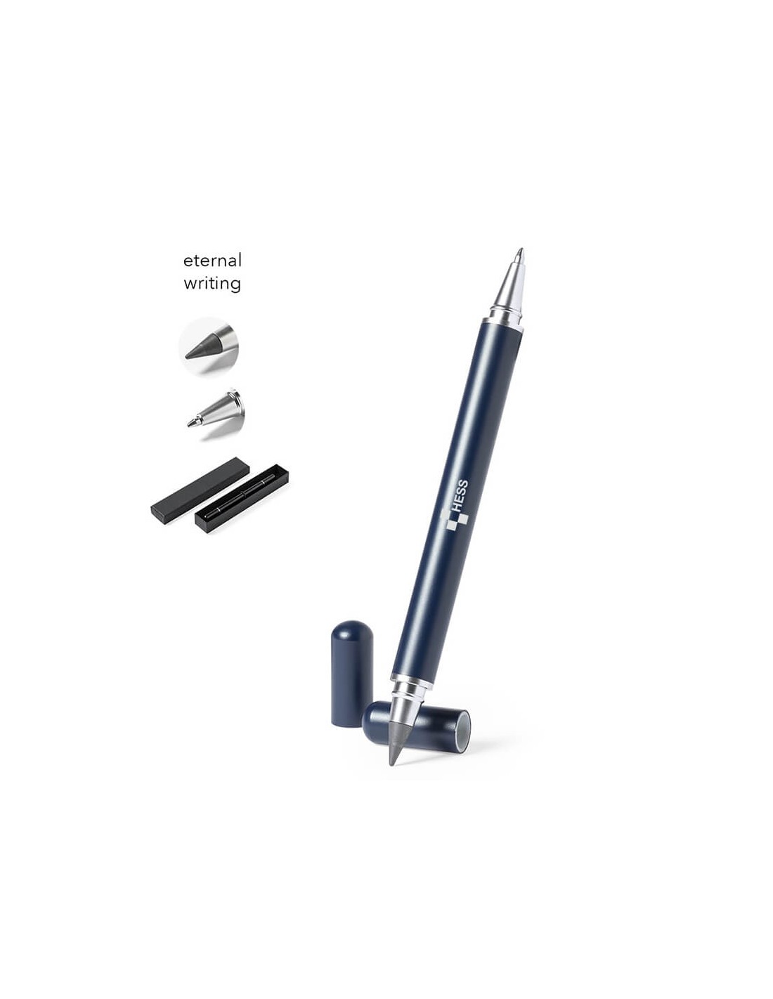Bolígrafo lápiz eterno 2 en 1, fabricado en resistente metal de acabado brillo. Con cierre de capucha, incluye bolígrafo en un extremo (carga jumbo y tinta azul), y lápiz eterno en el otro extremo, para así usar siempre el mismo lápiz y no generar residuos. Presentado en estuche individual negro. Carga Jumbo