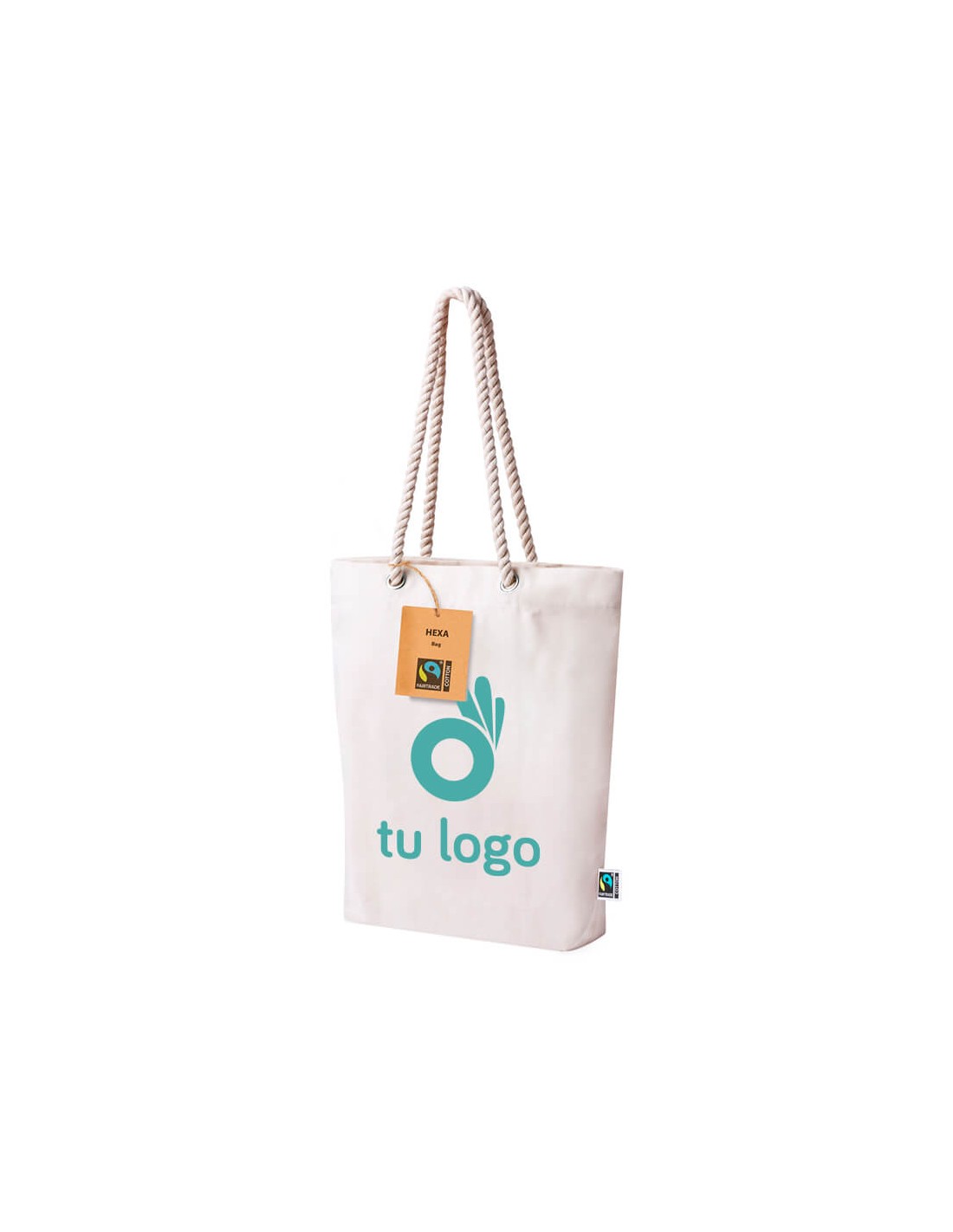 Bolsa de línea nature, fabricada en 100% algodón de 280g/m2 de color natural. Con certificación Fairtrade (Comercio Justo) un sistema comercial solidario y alternativo al convencional que persigue el desarrollo de los pueblos y la lucha contra la pobreza. De acabado cosido, asas en forma de cuerda y argollas para mayor firmeza. Resistencia hasta 10kg de peso. Incluida etiqueta Fairtrade y etiqueta con logotipo en cartón reciclado.