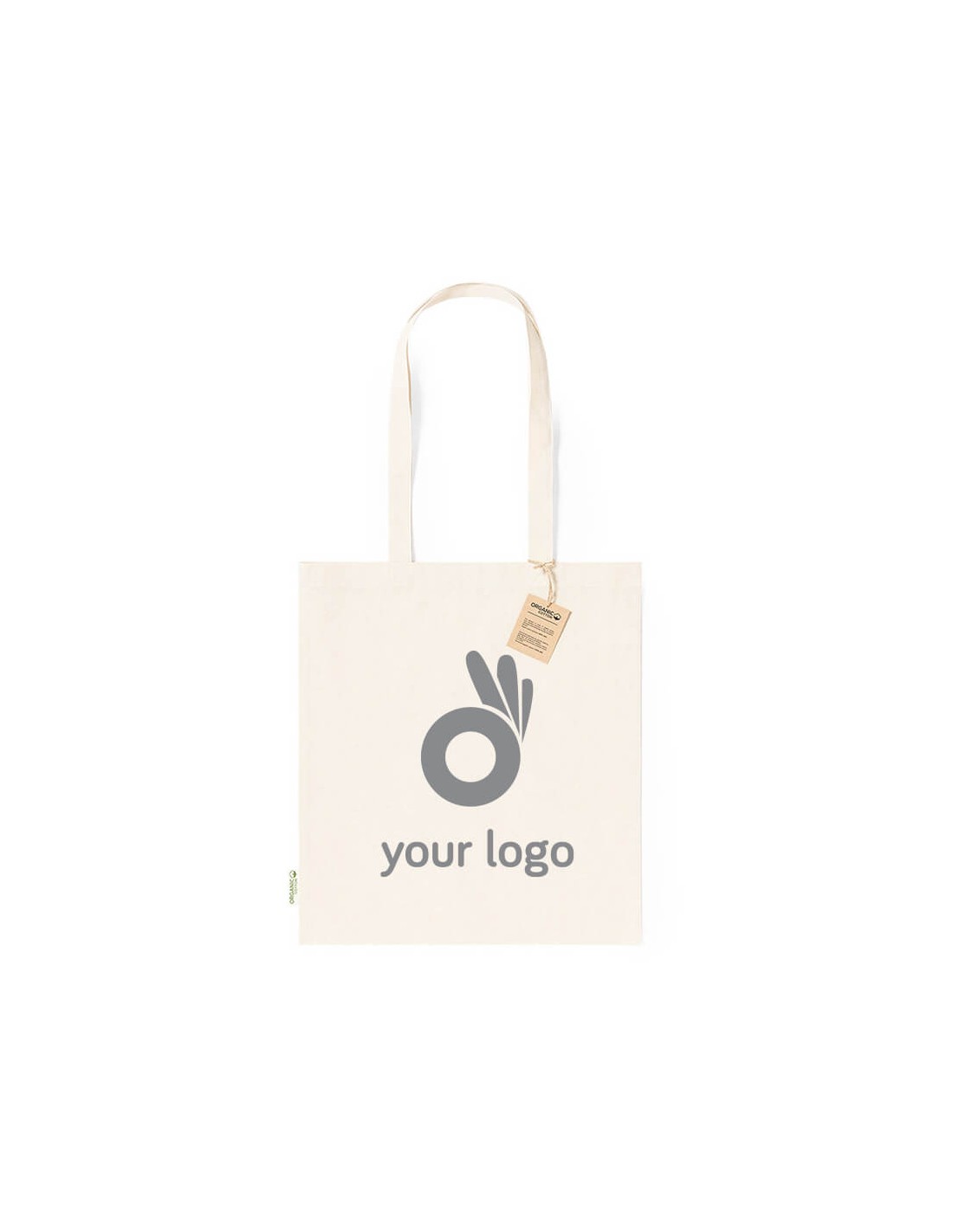 Bolsa fabricada en material100% algodón orgánico de 140g/m2 y en tono natural. Con certificación GOTS (Global Organic Textile Standard, ó Norma Mundial de Textiles Orgánicos) que garantiza que los tejidos están hechos de fibras orgánicas. De acabado cosido, con asas medianas reforzadas de 70 cm. Resistencia hasta 8kg, incluida etiqueta con distintivo de algodón orgánico y hangtag en cartón reciclado.