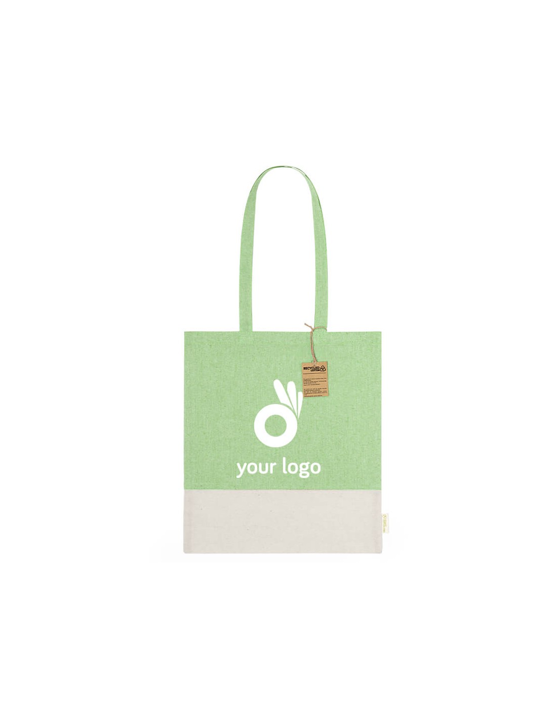 Bolsa en material 100% algodón reciclado de 120 g/m2. Asas largas de 70cm con refuerzo y de acabado cosido. Logotipo en etiqueta lateral y resistencia hasta 8 kg de peso. Disponible en variada gama de colores nature con base de color natural.