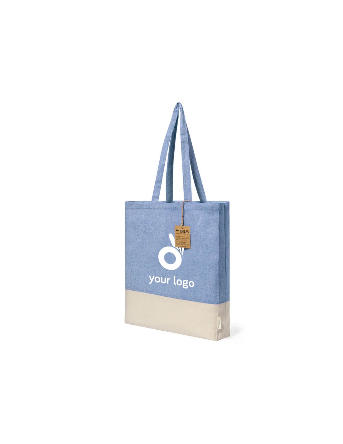 Bolsa en material 100% algodón reciclado de 120 g/m2. Asas largas de 70cm con refuerzo, de acabado cosido y fuelle. Logotipo en etiqueta lateral y resistencia hasta 8 kg de peso. Disponible en variada gama de colores nature con base de color natural.