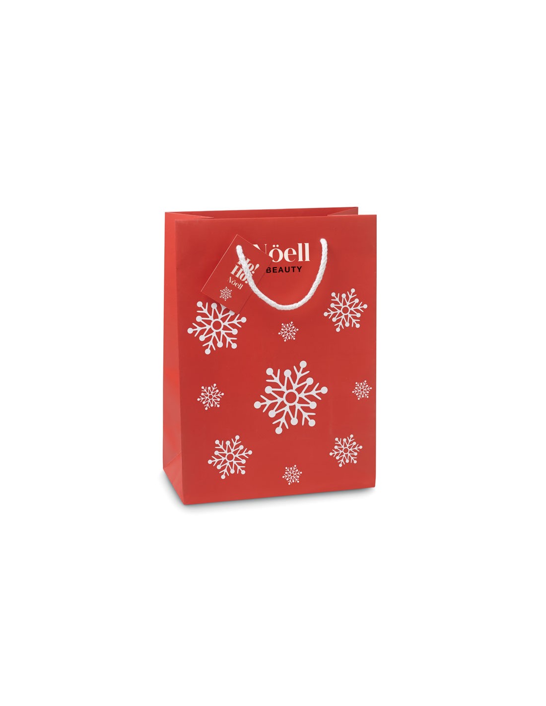 Bolsa tamaño mediana con estampado con copos de nieve en color blanco. Incluye tarjeta/etiqueta para escribir un mensaje.