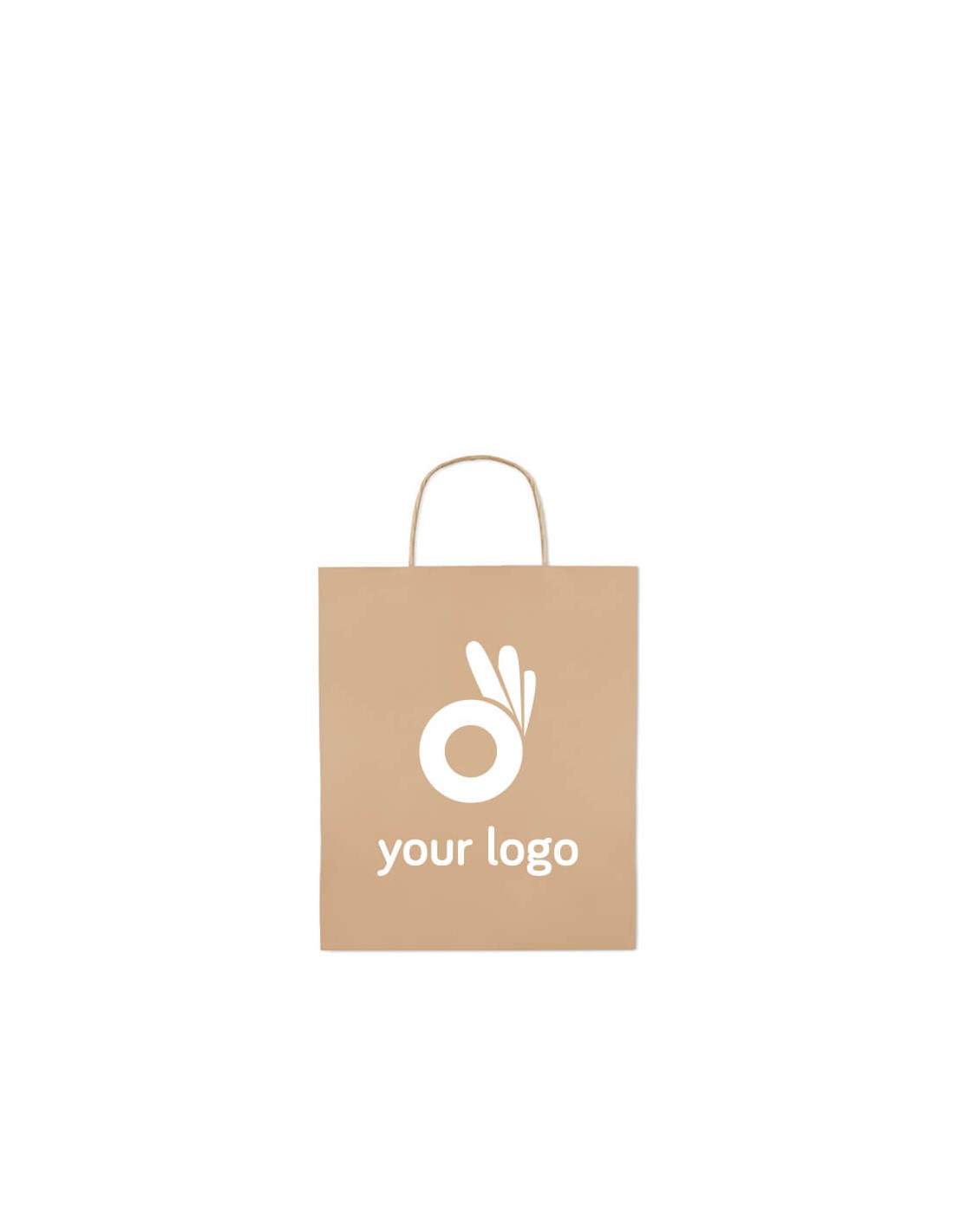 Bolsa en papel de acabado natural de 100g/m2 con asas cortas reforzadas y fuelle. Resistencia hasta 7kg de peso.