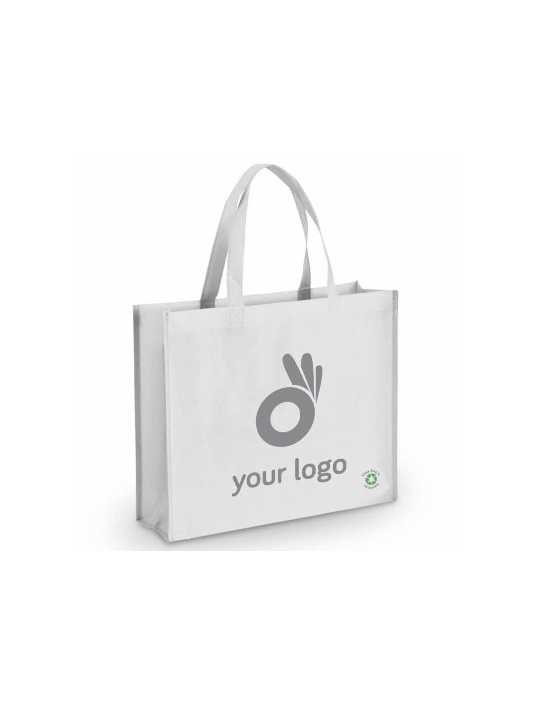Bolsa en non-woven laminado de acabado brillante. En variada gama de vivos colores, con asas medianas reforzada de 48 cm de largo. De acabado cosido, con fuelles y ribetes reforzados.