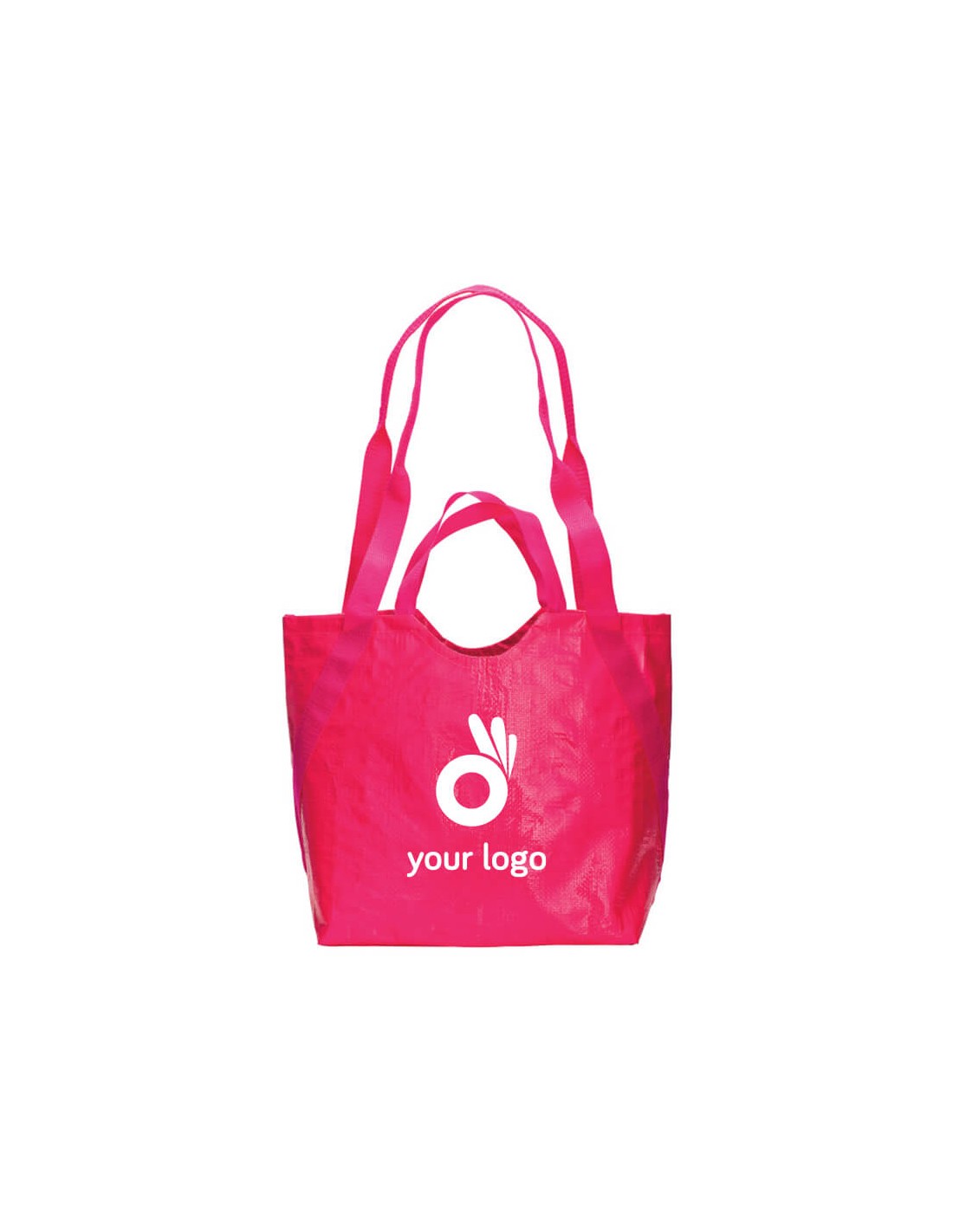 Bolsas de rafia con doble asa personalizadas fabricadas en PP laminado (120 g/m²). Disponibles en color rosa y azul.