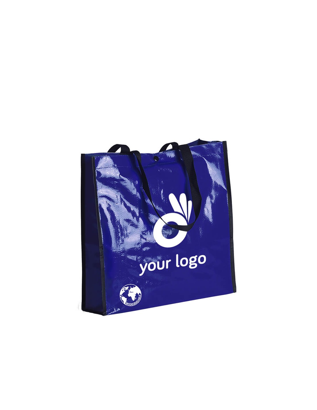 Bolsa reutilizable en resistente material laminado. Con asas largas reforzadas en nylon de 70cm, fuelle reforzado con ribetes y cierre de corchete. De acabado cosido y resistencia hasta 12kg de peso. Disponible en gama de colores brillantes. Biodegradable