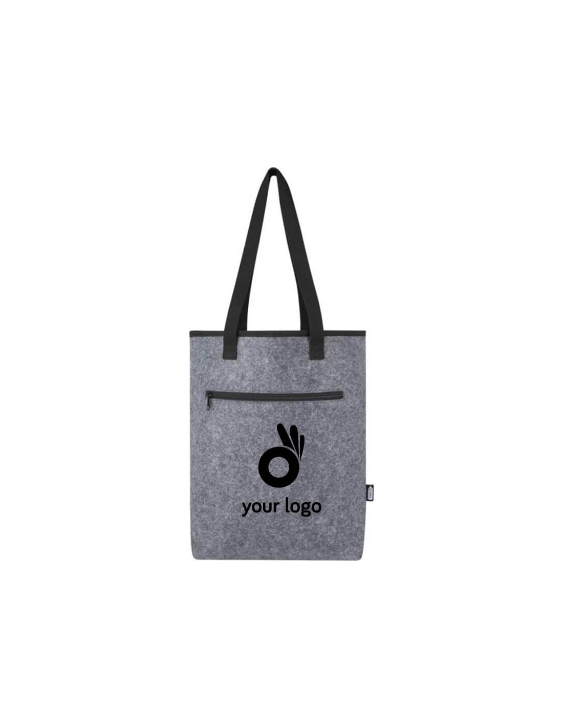 Bolsas térmicas y ecológicas fabricadas en fieltro reciclado. Estas bolsas tienen asas largas y bolsillo externo frontal. Acabado en color gris.