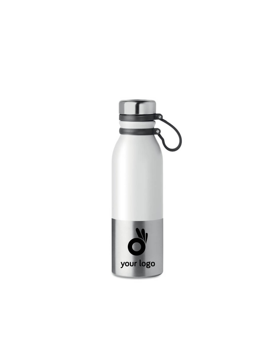 Botellas de agua promocionales con correa de silicona y capacidad de 600 ml. Estas botellas promocionales son de alta calidad e ideales para promocionar tu empresa. Su doble pared de acero inoxidable permite que sea un modelo resistente a golpes y caídas. Además su diseño exclusivo con la base en acero a juego con el resto de la botella crea un modelo único y de calidad. Ideal para regalar a tus principales clientes o para darte a conocer como empresa. También tiene un sistema anti goteo para evitar cualquier derrame de agua. Disponibles en color blanco, negro, gris y azul. Material: Acero inoxidable Medidas: Ø7 x 24 cm Peso: 292 g Caja de presentación