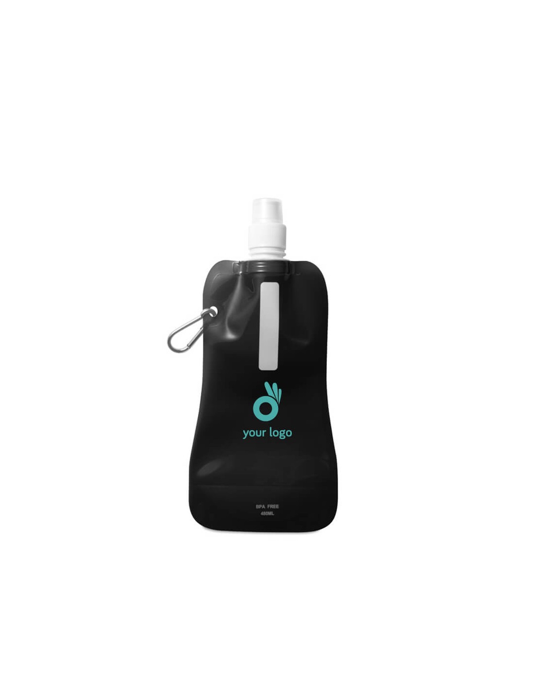 Botellas de agua personalizadas plegables con capacidad para 480 ml. Estas botellas están fabricadas en plástico PET y no contiene BPA. Incorporan un mosquetón de aluminio y un tapón antifugas. Son ideales para usar como productos promocionales en gimnasios o empresas vinculadas con el sector del deporte. Material: Plástico PET Medidas: 26 x 12 cm Peso: 30 g