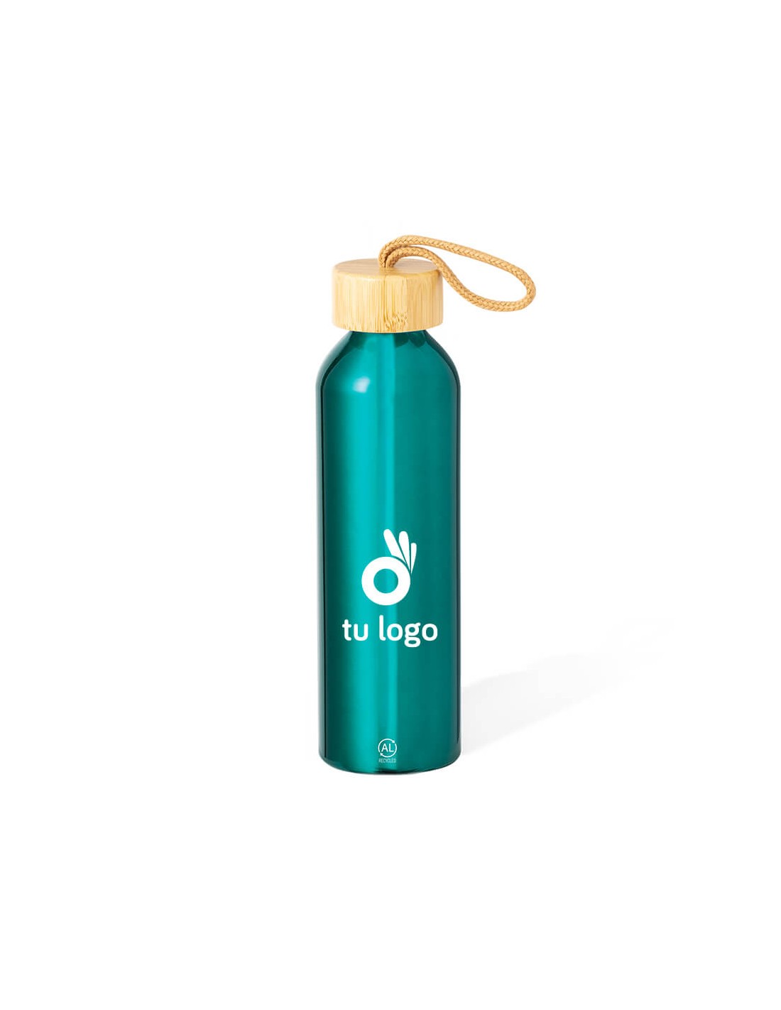 Botellas de aluminio reciclado disponibles en 7 colores vivos. Tapón de rosca en bambú con asa integrada. Capacidad de 600ml.