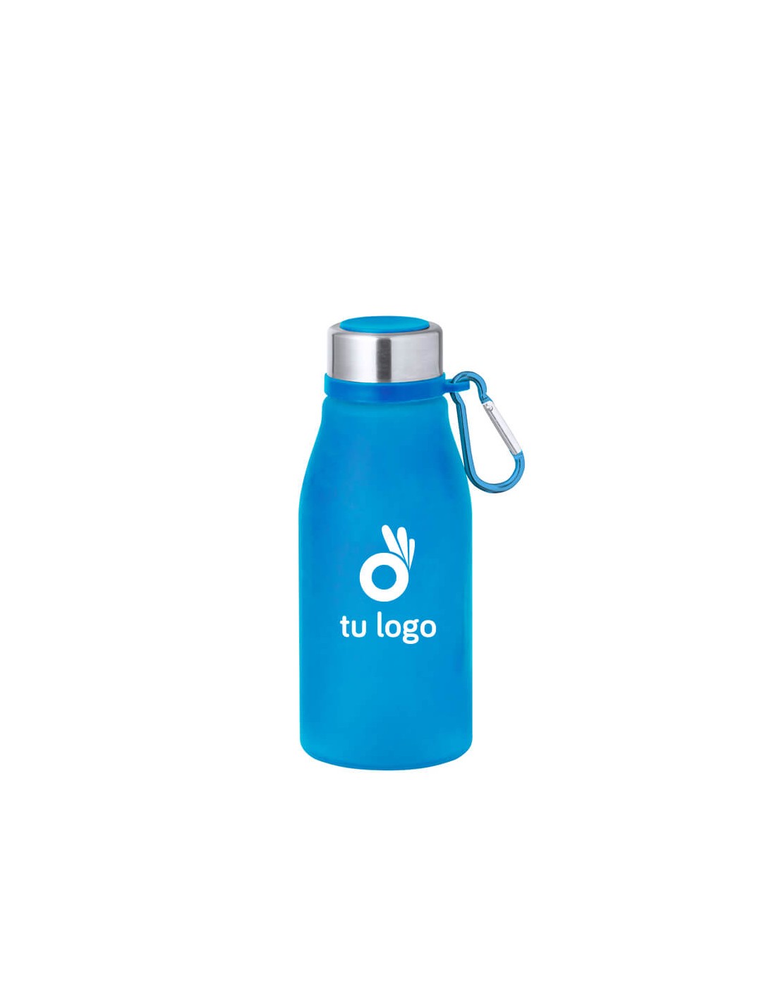 Botellas para el día a día con capacidad de 370ml, fabricadas en RPET, libre de BPA. Sistema de tapón con rosca, acompañado de mosquetón. Disponibles en 6 colores.