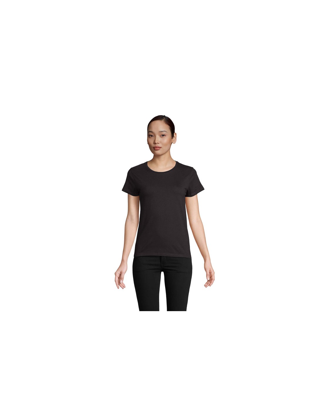 SOL'S CRUSADER Camiseta Mujer 150g/m². Punto liso 150, 100% algodón orgánico, enriquecido mediante un tratamiento enzimático para un tacto más suave, acabado de canalé en el cuello, cuello redondo, tapa costuras en el cuello, corte ajustado, cortado y cosido.