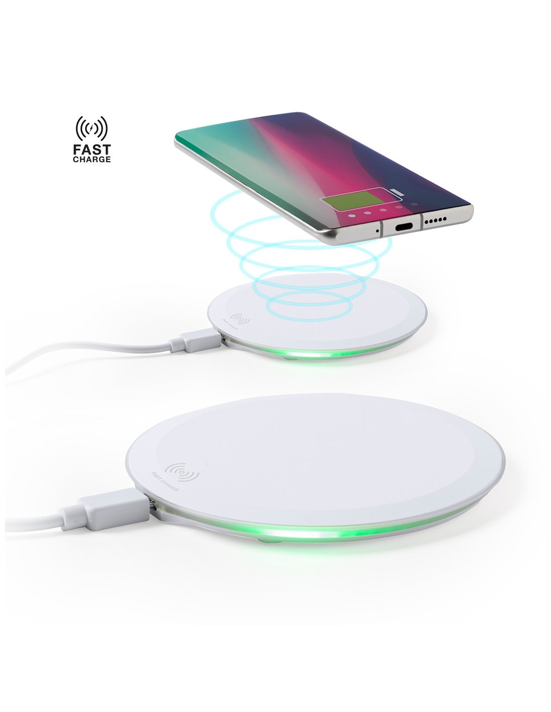 Cargadores inalámbricos personalizados de carga rápida de 10 W. Estos cargadores están diseñados con una base antideslizante e indicador de luz LED que indica el estado de la carga del dispositivo. Incluyen un puerto USB y un micro cable USB. Tienen la capacidad de cargar dos dispositivos de forma simultánea, siempre y cuando los dispositivos sean compatibles con la tecnología de carga inalámbrica. Vienen presentados en una caja individual. Material: Plástico Medidas: 0.9 cm x 10 Ø Peso: 48 g