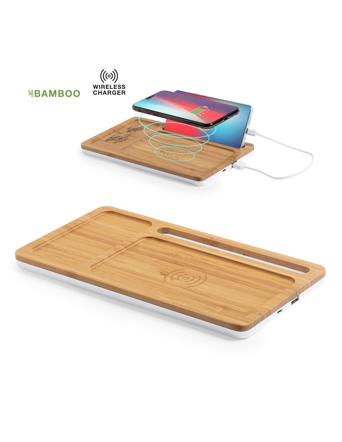Cargadores inalámbricos con organizador para material de oficial promocionales. Estos cargadores están fabricados en línea nature con bambú y incluyen un cable de carga con una salida USB de 1.000 mA, permiten cargar de manera simultánea hasta dos dispositivos. Material: ABS / Bambú Medidas: 25,5 x 1,4 x 13,5 cm Peso: 202 g