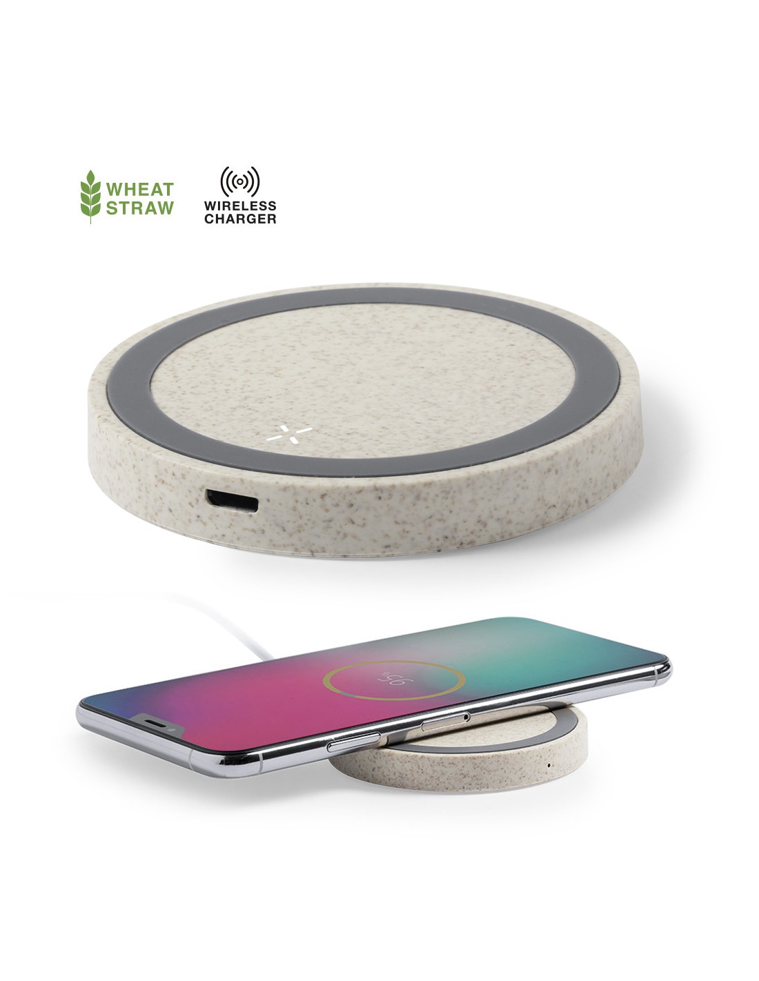 Cargadores inalámbricos promocionales para smartphones de diseñó circular. Estos cargadores ideales para empresas están fabricados con caña de trigo y presentan un acabado de línea nature. Incluyen una base antideslizante y un indicador LED que indica el estado de la carga del dispositivo. Estos cargadores circulares solo funcionan con dispositivos que cuentan con tecnología de carga inalámbrica. Material: ABS / Caña de trigo Medidas: 1 cm x 0,7 Ø Peso: 33 g