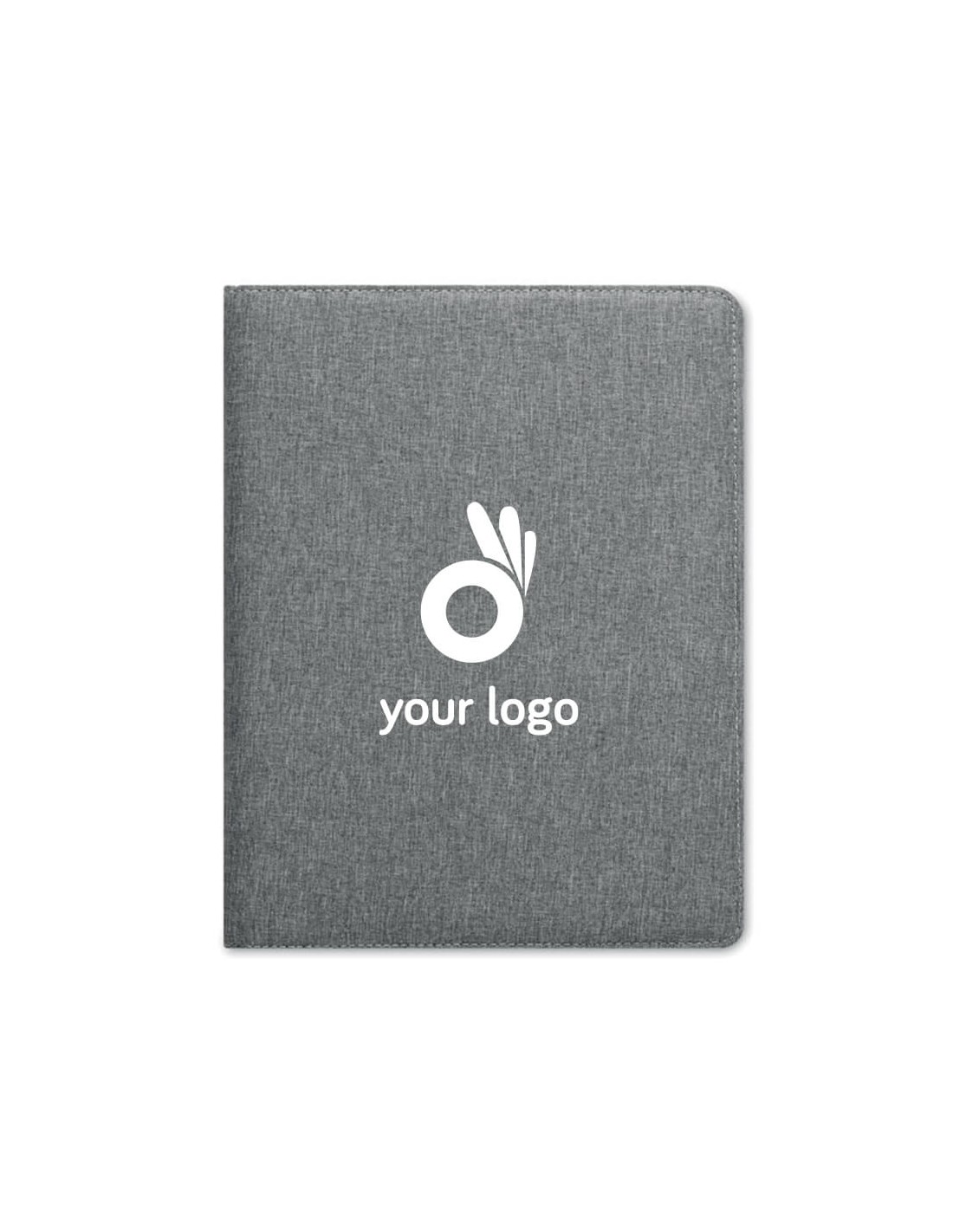 Porta documento jaspeado A4 de RPET 300D. Contiene compartimentos interiores y porta bolígrafo. Incluye un bloc de notas de 20 hojas rayadas.