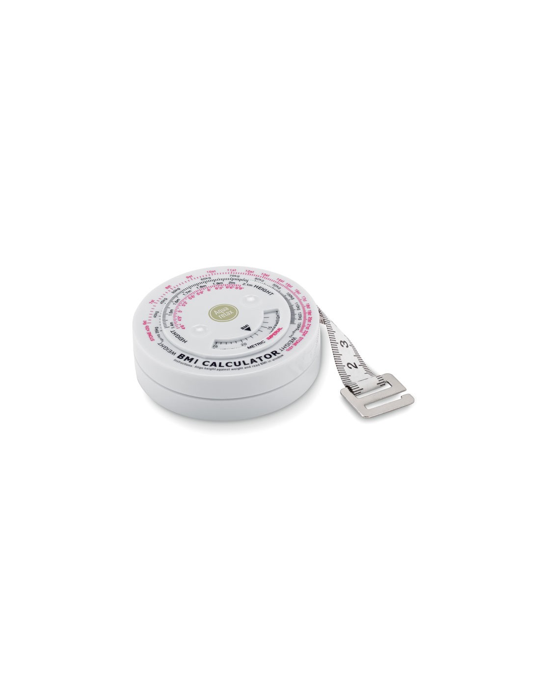 Cintas métricas promocionales para masa corporal. Se trata de un producto realizado en ABS cuya funcionalidad es medir el Índice de Masa Corporal. Es por ello que es un regalo de merchandising ideal para consultas de médicos y enfermeros. Además, dispone de una área de marcaje central para poder personalizarla a tu gusto. Disponibles en color blanco. Material: Plástico ABS Medidas:Ø7 x 2 cm Peso: 65 g