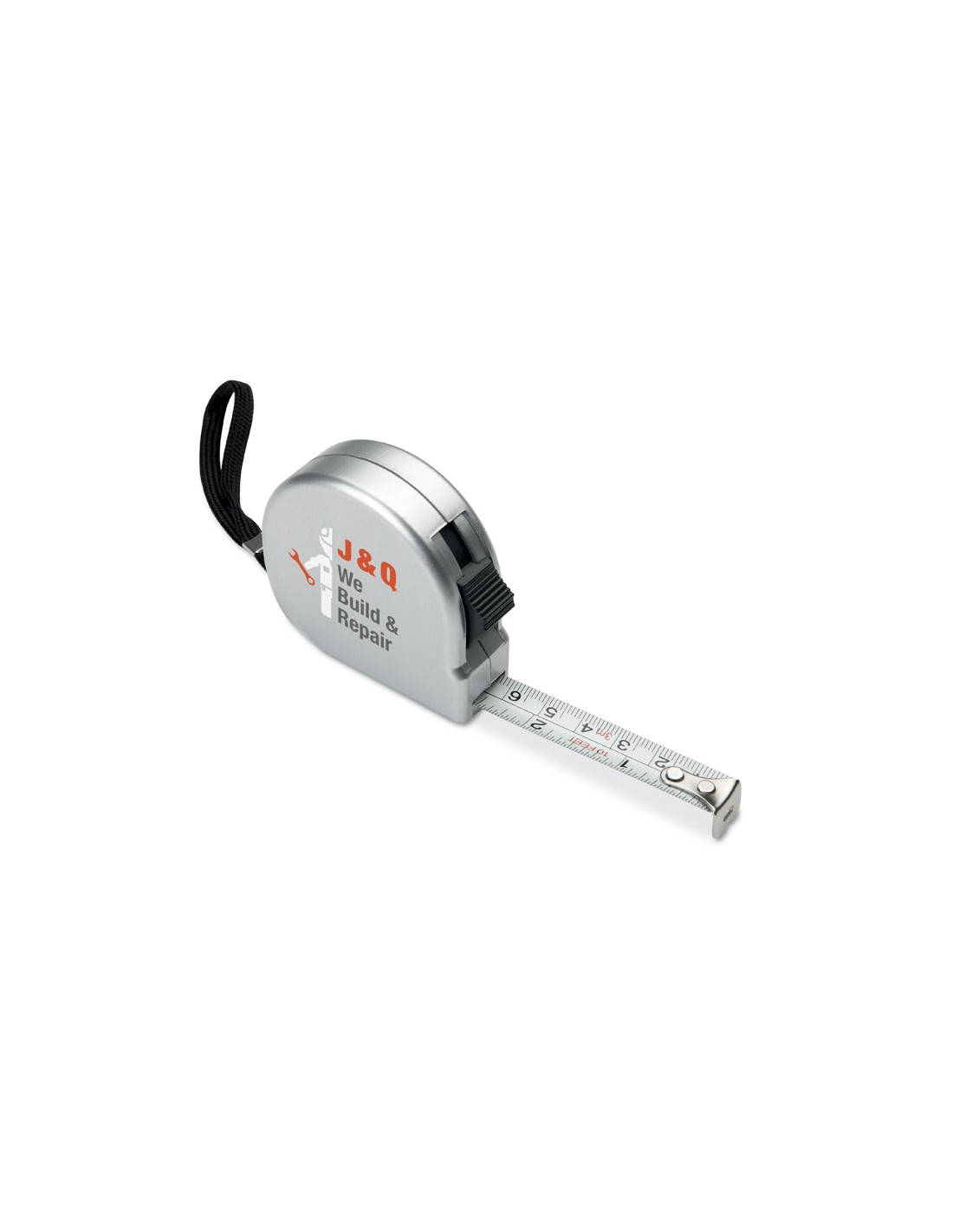 Cinta métrica de 2m en ABS en color plateado mate. Incluye correa de mano para sujetarla y clip de metal plateado.