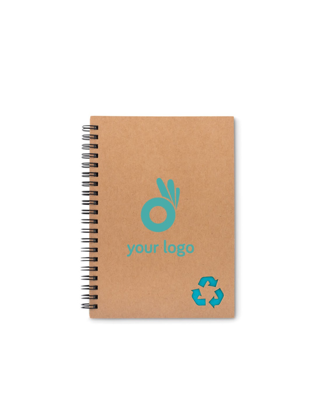 Cuadernos de anillas con 70 hojas y tapa de cartón reciclado, Este tipo de libretas publicitarias están pensadas para que plasmes tu imagen corporativa o texto en ellas y personalizes tu cuaderno como tu quieras, El producto está fabricado a base de piedra natural (caronato de cálcio) y plástico (HDPE), Este tipo de cuadernos son ideales para llevar en cualquier congreso, evento o para tenerlas en la oficina, de esta forma el logo de tu marca se visualizará mucho más,La imagen del diseño reciclado está disponible en color negro, turquesa, naranja, verde, azul, rojo, Material: Cartón Medidas: 18,5 x 13 cm Peso: 220 g Papel: Rayado