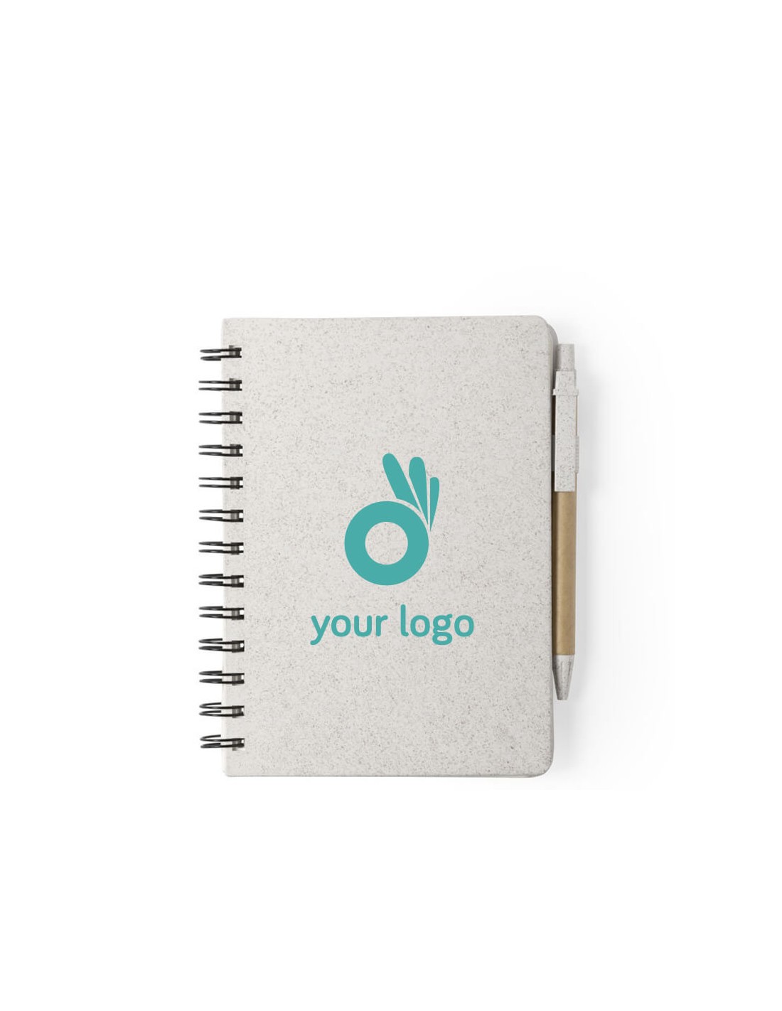 Cuadernos estampados con anillas y con tapas rígidas fabricadas en caña de trigo, para así fomentar la utilización de materias primas naturales y reducir las emisiones contaminantes. Incluyen bolígrafo de mecanismo pulsador, hechos en cartón reciclado y caña de trigo y con tinta azul. Estos cuadernos disponen de 80 hojas de diseño eco rayadas. La portada rígida proporciona una gran sensación de calidad ideal para que tus clientes, proveedores y empleados asocien tu empresa con una imagen de gran profesionalidad. Material: Cartón reciclado, caña de trigo y PP Medidas: 13.5 x 17.9 x 1.8 cm Peso: 255 g Papel: rayado