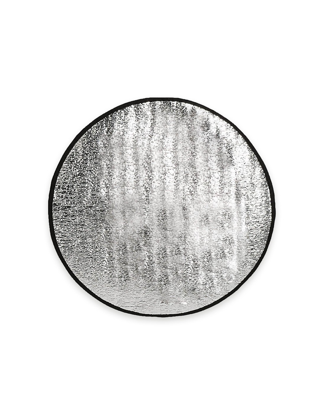 Cubrevolante en aluminio a una cara en color plateado de acabado metalizado con ribetes de poliéster en color negro. De 43cm de diámetro y espuma en el reverso. Presentación desplegado en plancha para fácil impresión.