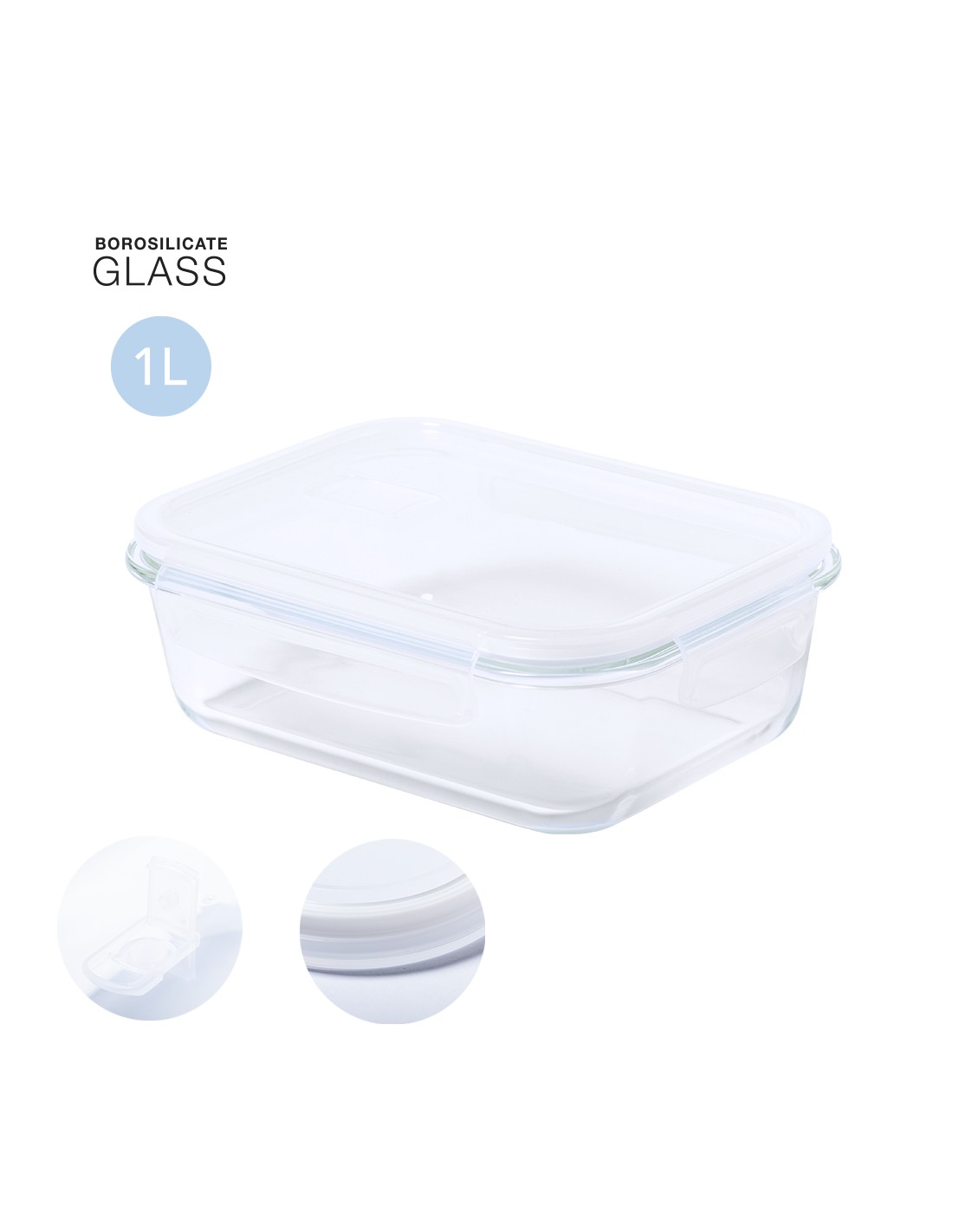 Fiambreras transparente de cristal con tapa de seguirdad hermética en acabado traslúcido y válvula de sistema de apertura