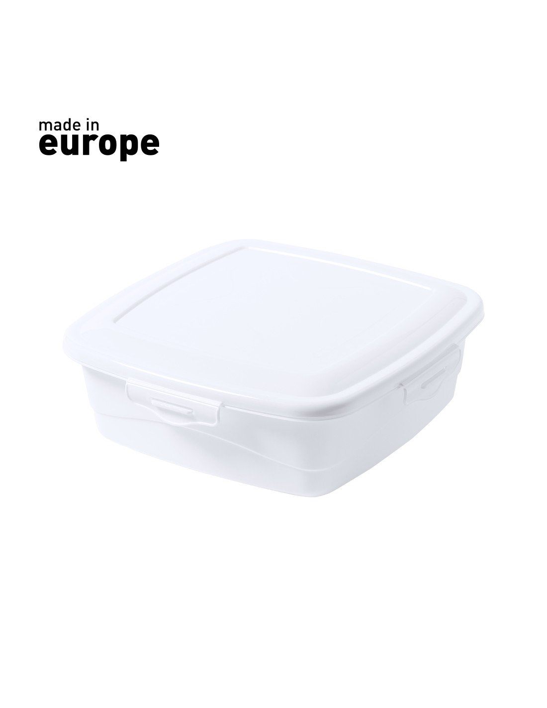 Fiambreras de PP blanco con cpaacidad de 1 L en forma cuadrada y con cierres de seguridad.