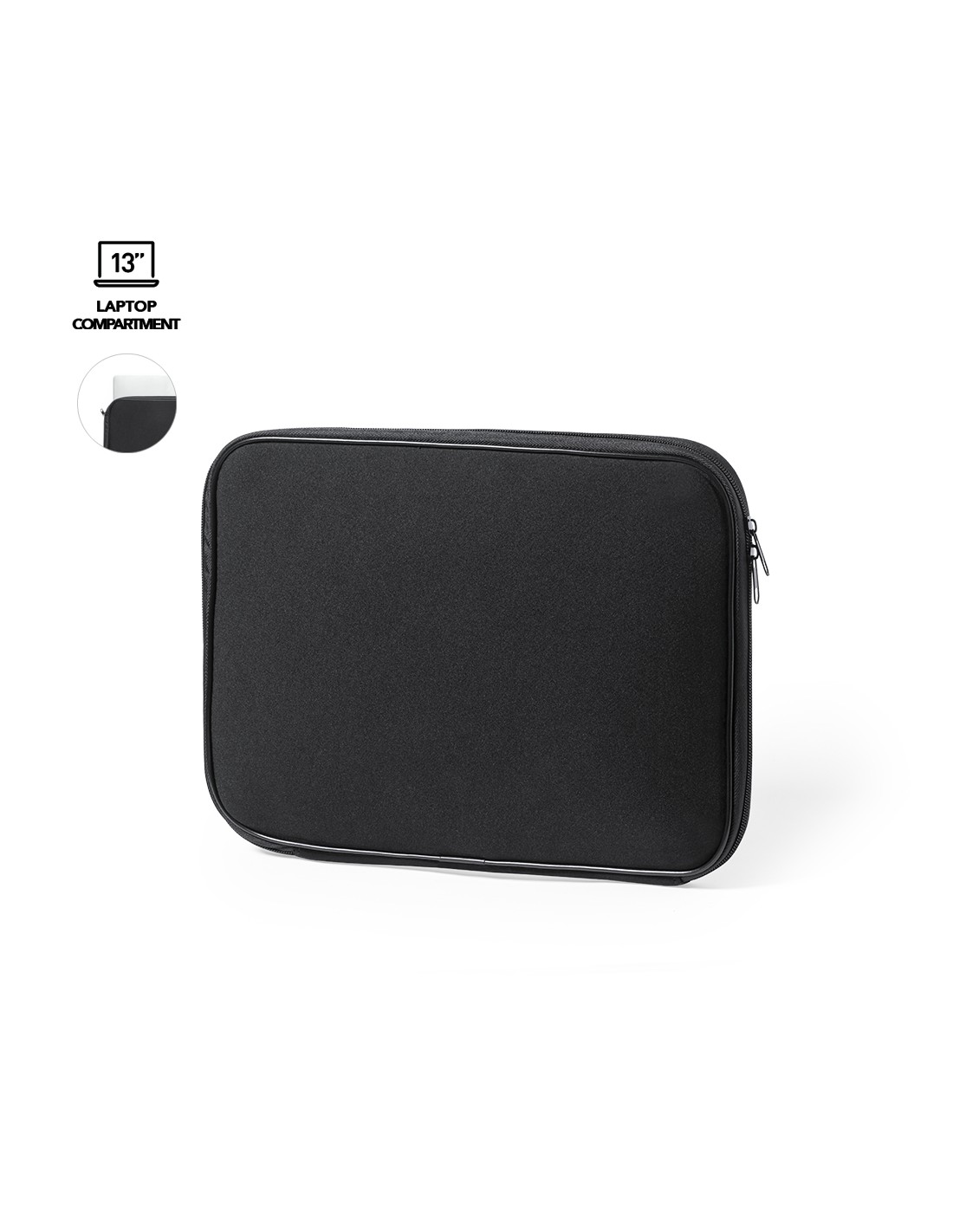 Funda para ordenador portátil, fabricada en resistente soft shell. En elegante color negro, con interior acolchado. Cierre de cremallera a juego con doble tirador. Para ordenador portátil o tablet de hasta 13 pulgadas.