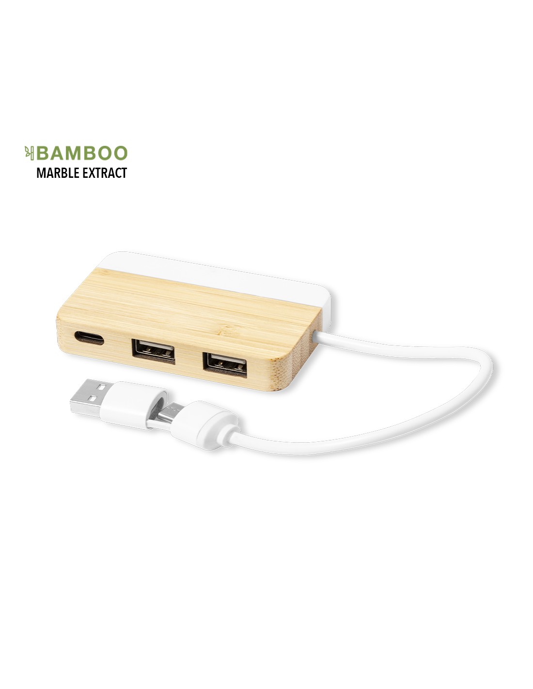 Puerto USB 2.0 de línea nature. Fabricado en bambú, con detalle en extracto de mármol. Incluye puerto Tipo C y 2 puertos USB, con entrada dual USB/Tipo C. Presentado en caja individual de diseño kraft. Fabricado conforme a estándares RoHS, con sistema de bloqueo para evitar cortocircuitos. 1 Puerto Tipo C. 2 Puertos USB 2.0