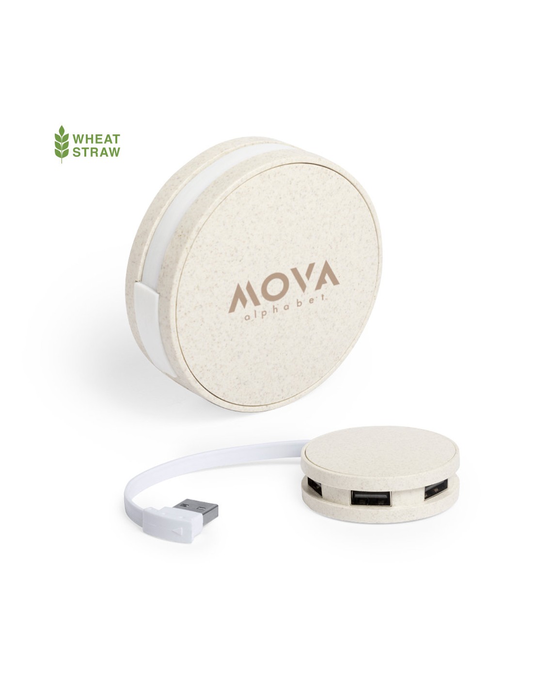 Original y compacto puerto USB de forma redondeada de línea nature. Carcasa en caña de trigo, para así fomentar la utilización de materias primas naturales y reducir las emisiones contaminantes. Con 4 puertos USB 2.0 para conectar multitud de dispositivos y amplia superficie de marcaje. Presentado en caja individual de diseño eco. 4 Puertos. USB 2.0