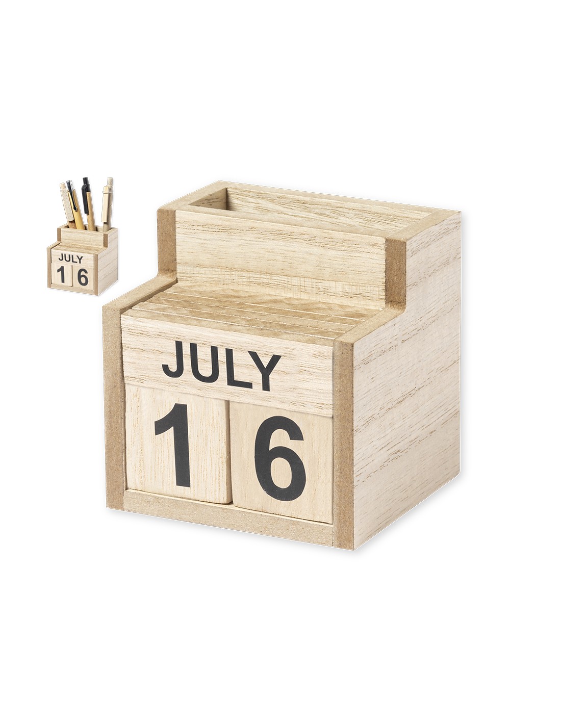 Lapicero calendario perpetuo de línea nature: ya no es necesario cambiar de calendario cada año, con el beneficio al medio ambiente que esto supone. Fabricado en MDF, con tipografía de fácil lectura. Presentado en caja individual de diseño kraft.