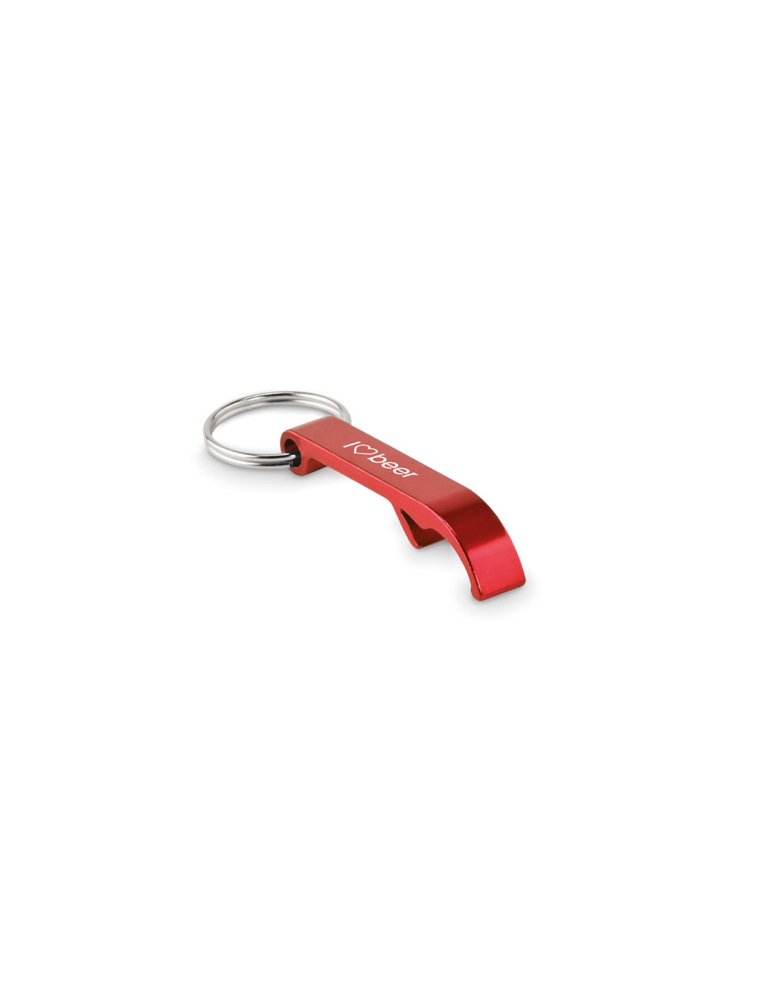 Abridor de botellas con llavero de aluminio reciclado en acabado brillante.