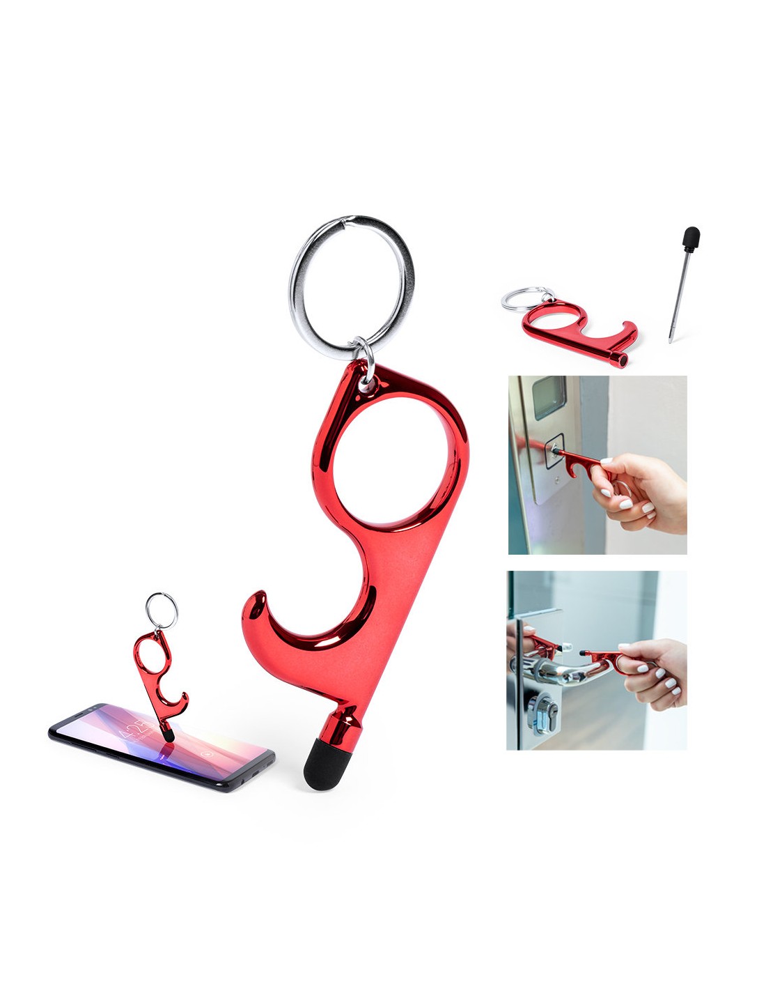 Llaveros anticontacto promocionales con puntero extraíble. Estos llaveros higiénicos están fabricados en ABS con acabado metalizado e incluyen bolígrafo y puntero extraíbles. Es un producto especialmente diseñado para evitar tocar con las manos superficies de uso común, como puertas, botones, interruptores o grifos. Además, dispone de un cómodo troquel para su cómodo uso. Presentados en bolsas individuales de diseño. Disponibles en una variada gama de colores: Azul, negro, plateado y rojo. Material: ABS Medidas: 3 x 7,3 x 0,5 cm Peso: 7 g