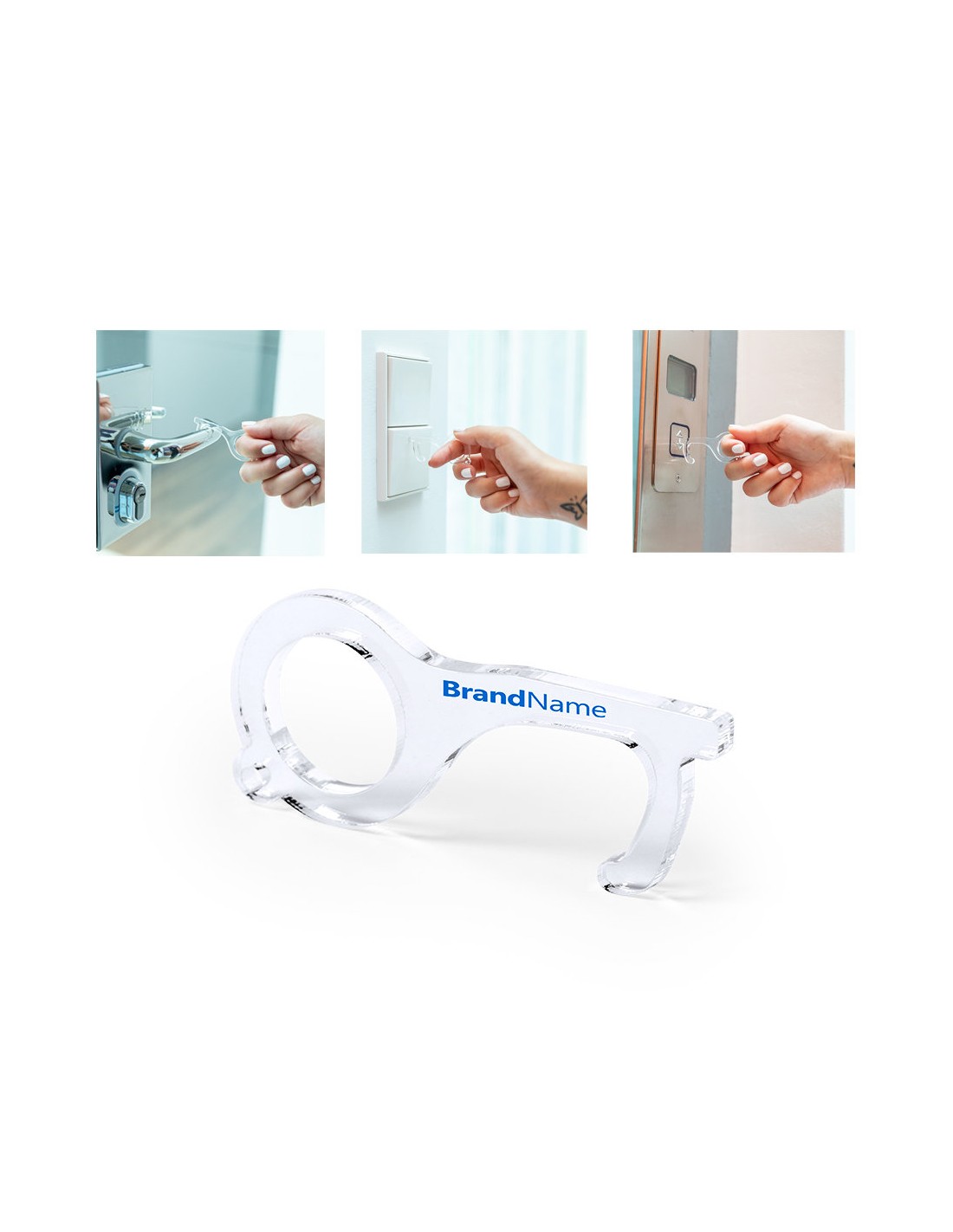 Llaveros anticontacto transparentes para empresas. Se trata de llaveros higiénicos fabricados en un original y resistente material acrílico de acabado transparente. Es un producto exclusivamente diseñado para evitar el contacto directo con superfícies y objetos de uso común, así como manivelas de puertas, interruptores, grifos de uso público o cajeros automáticos. Además, disponen de un cómodo troquel para el dedo índice, por lo que se trata de un producto ergonómico. Presentados en bolsas individuales de diseño. Material: Acrílico Medidas: 3,1 x 7,2 x 0,4 cm Peso: 4 g