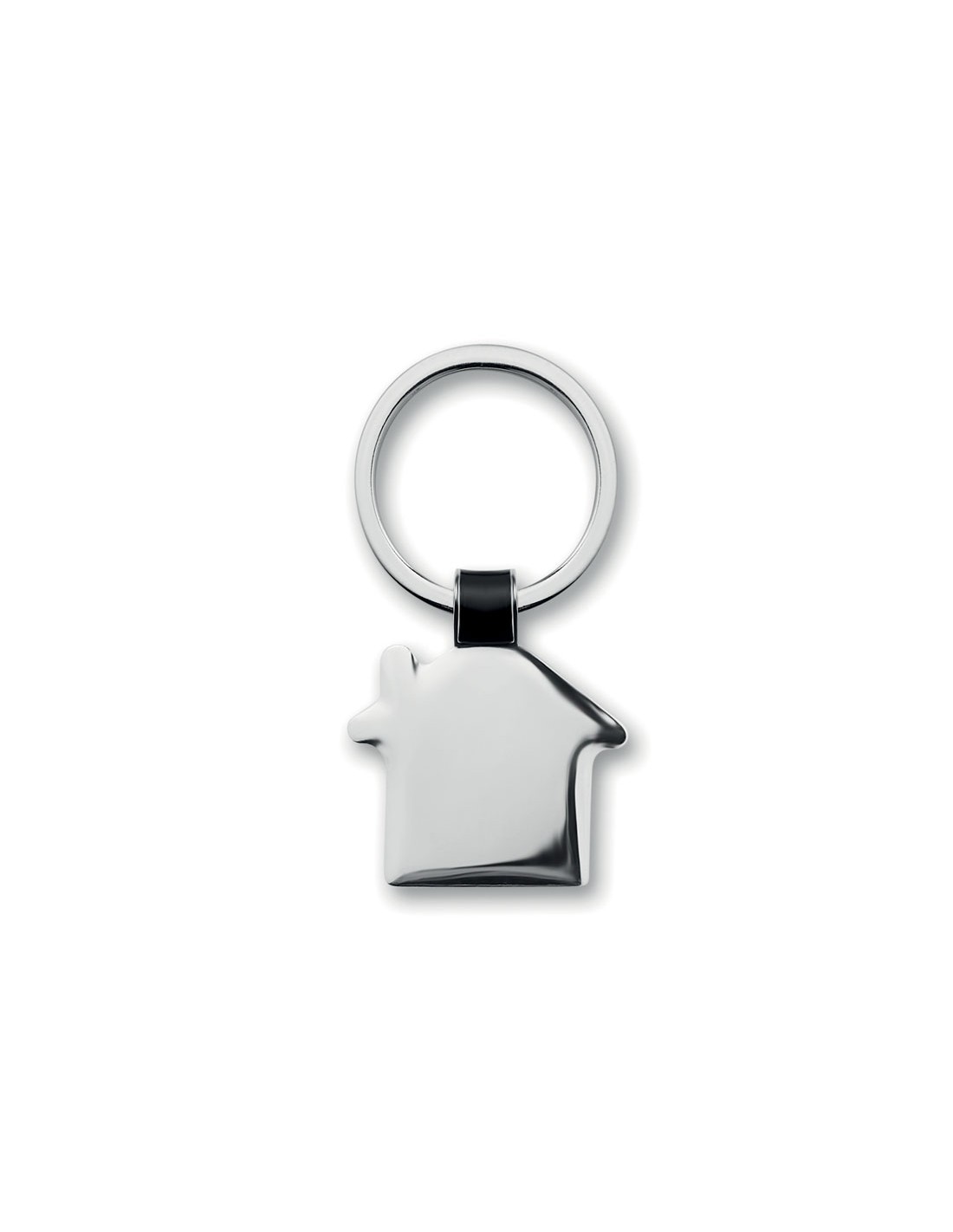 Llaveros corporativos fabricados en metal con acabado níquel brillante con forma de casa. Estos llaveros estan hechos con un diseño elegante gracias al enganche que une la pieza principal con la anilla. Además se presentan en una caja de cartón negra. Son perfectos para empresas de construcción o inmobiliarias. Material: Metal Medidas: 3,7 × 3 × 0,2 cm Peso: 34 g