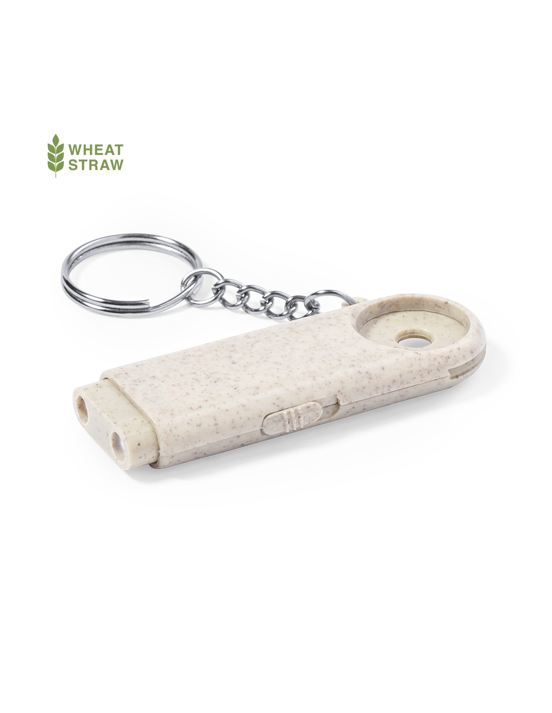Llavero moneda con linterna integrada, fabricado en caña de trigo y ABS. Con práctica moneda, 2 LEDs y alimentación a pilas (de botón incluidas). Con distintivo Wheat Straw y presentado en bolsa individual reciclada. Elaborado con elementos vegetales para así fomentar la utilización de materias primas naturales y reducir las emisiones contaminantes. 2 Ledes. Pilas Botón Incluidas