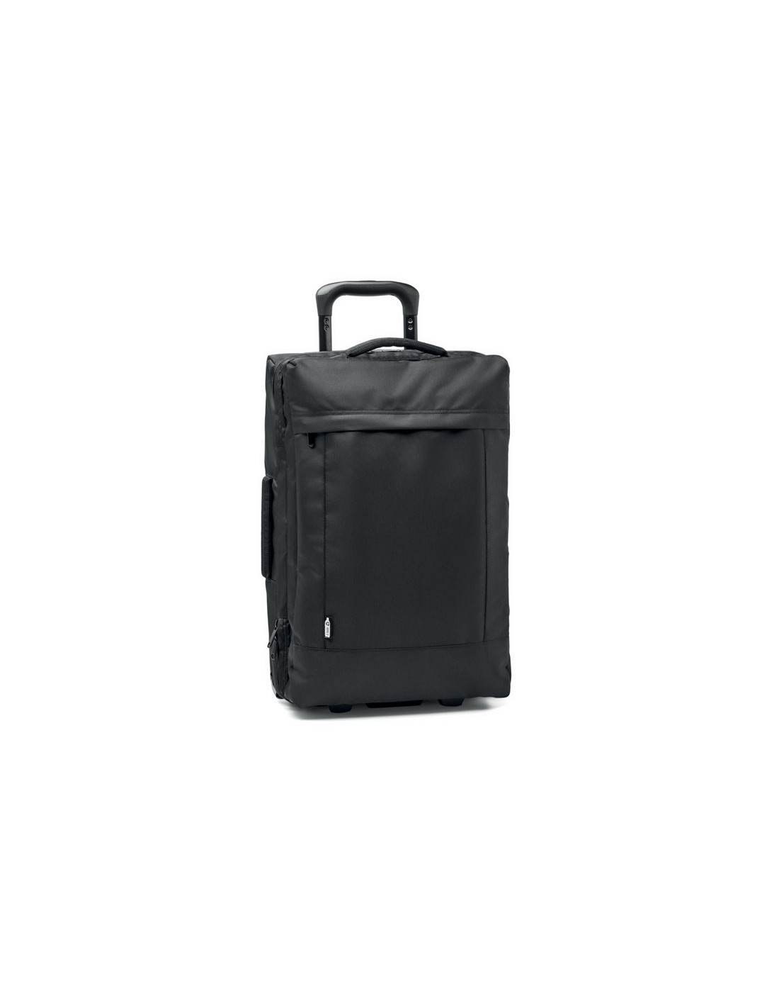 Trolley de RPET 600D con base rígida. Compartimento doble, compacto y espacioso con cremallera. Un bolsillo frontal con cremallera y asas superior, lateral e inferior. Cierre de seguridad integrado. 2 ruedas.